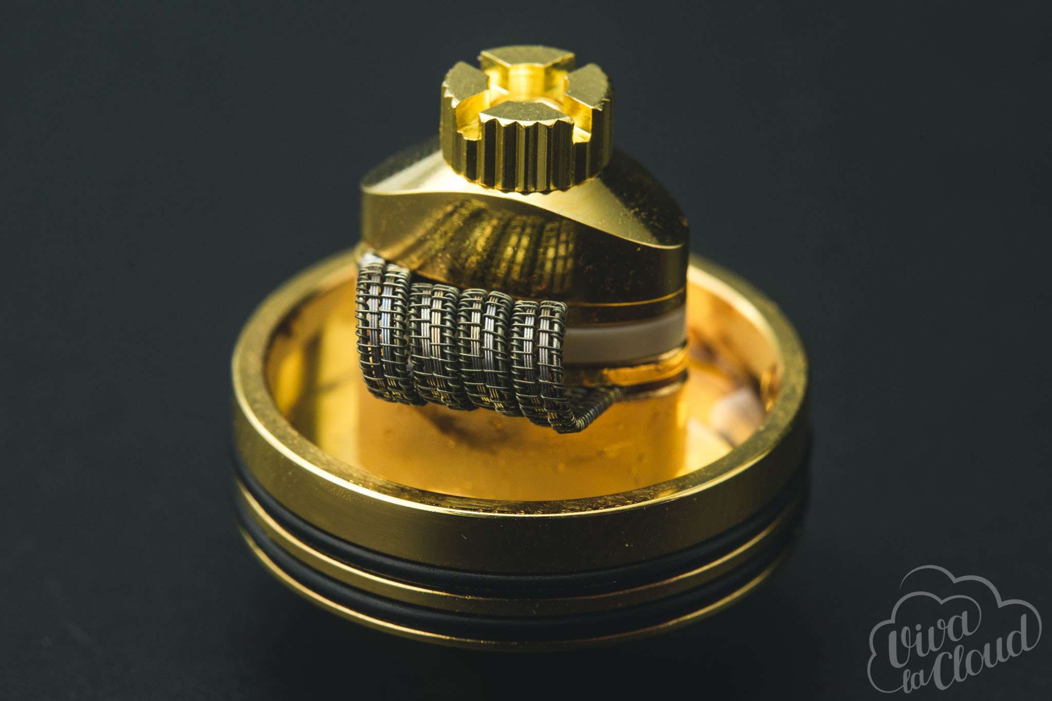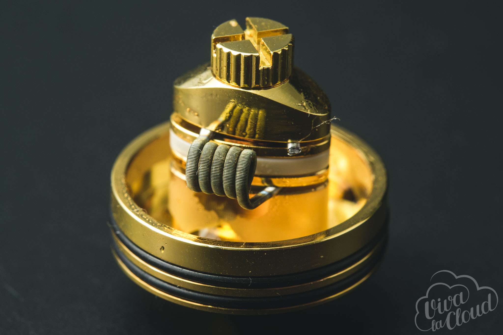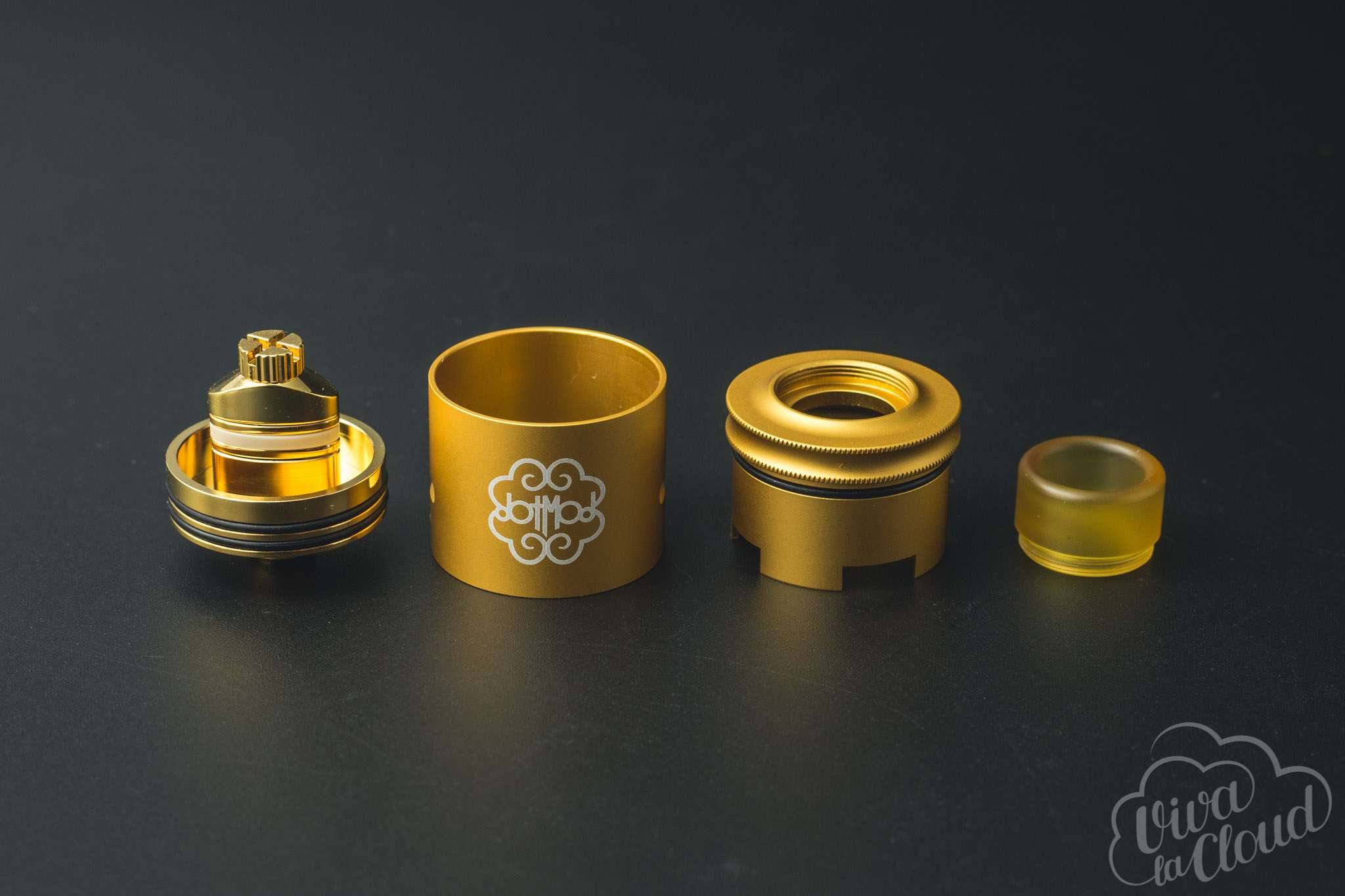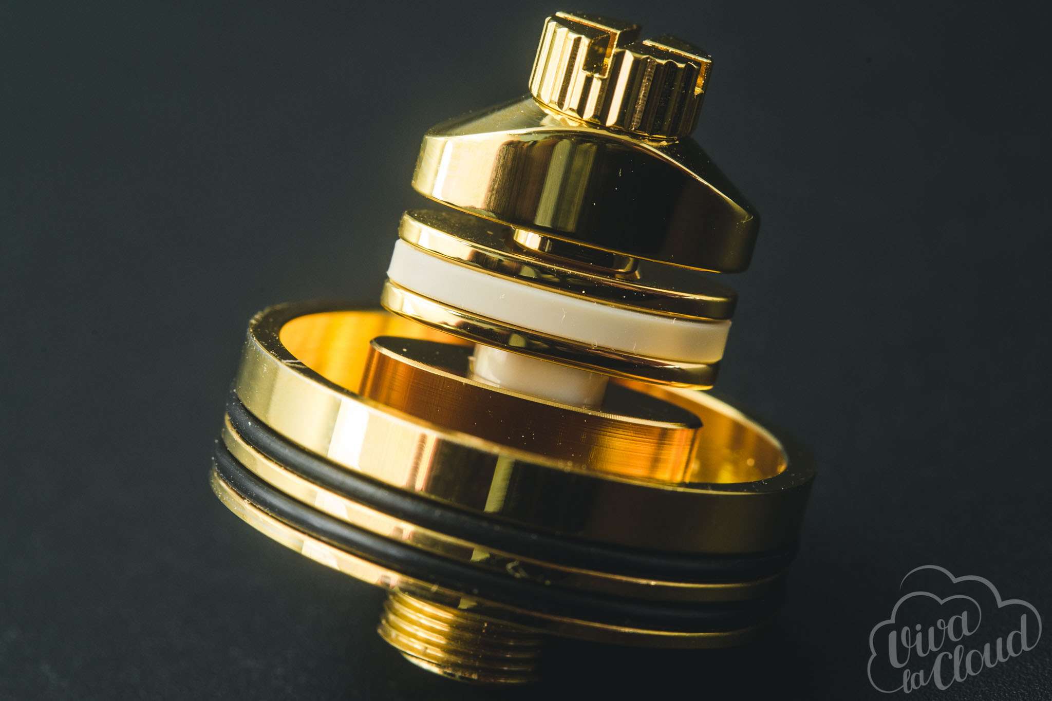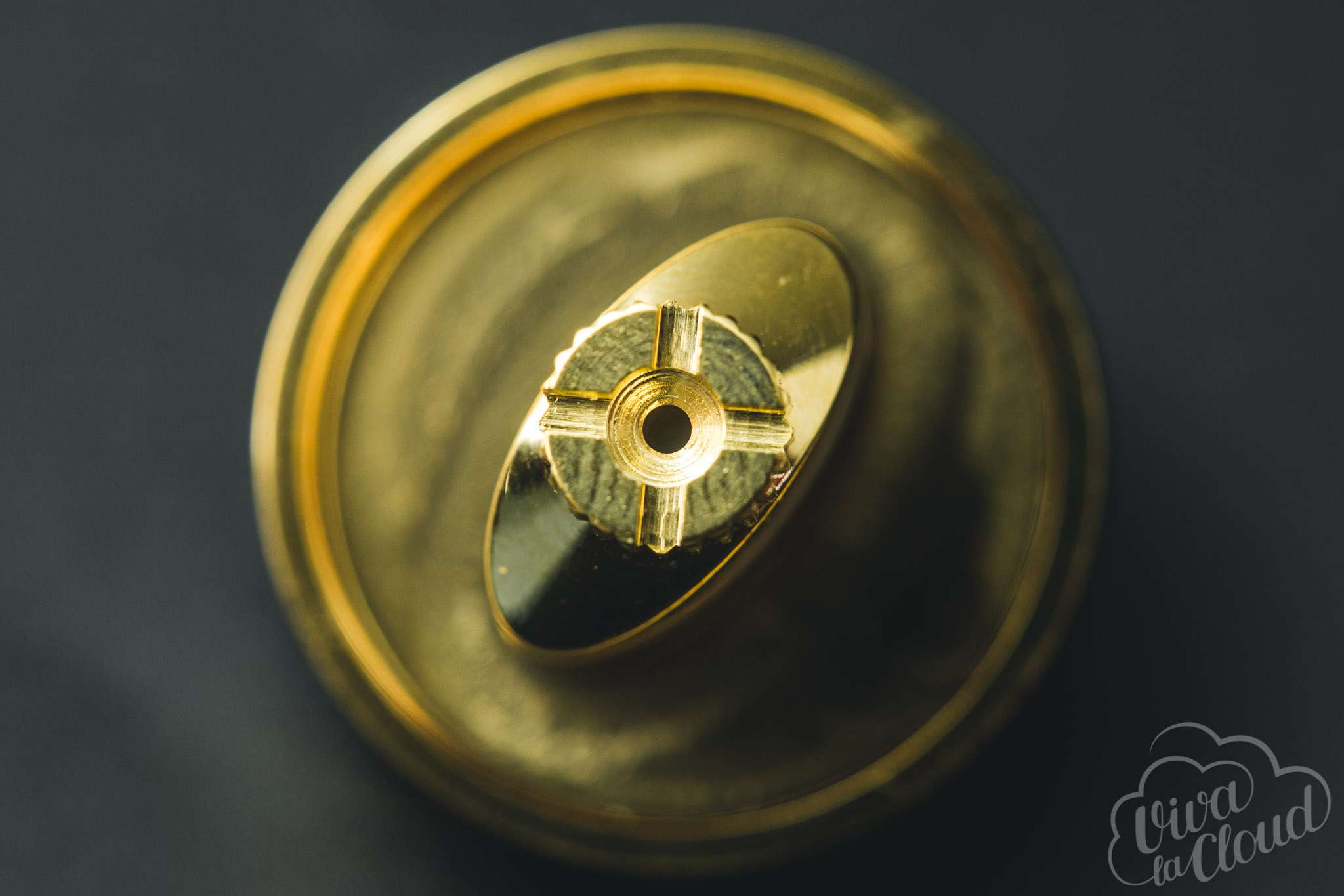 DotRDA может похвастаться одной стойкой и одним же винтом в ней. Это позволило увеличить объем колодца и освободить место для более удобной установки спиралей. Выглядит все аккуратно, красиво и позолочено. Отверстия обдува дрипки перенесены вниз и немного уменьшены, их регулировке помогают насечки на верхней части топкепа. Главный минус этой детали — дриптип на резьбе. Моя коллекция красивейших 810-х дриптипов к DotRDA не подошла.