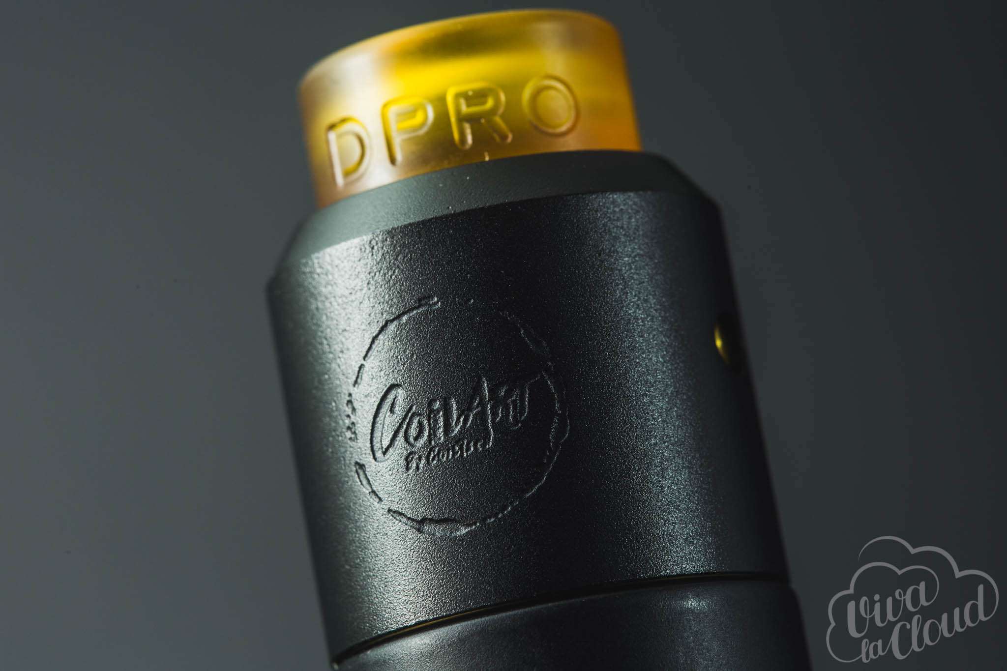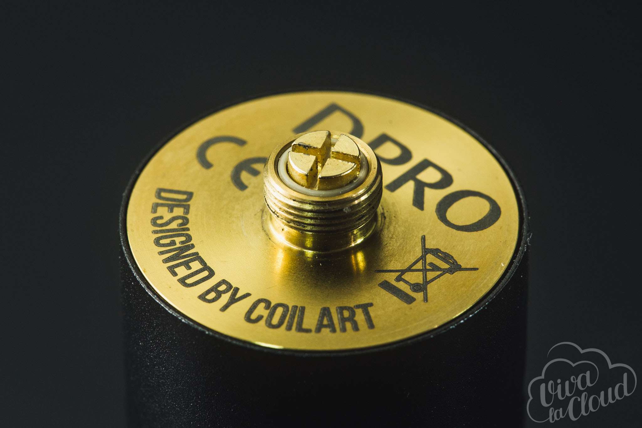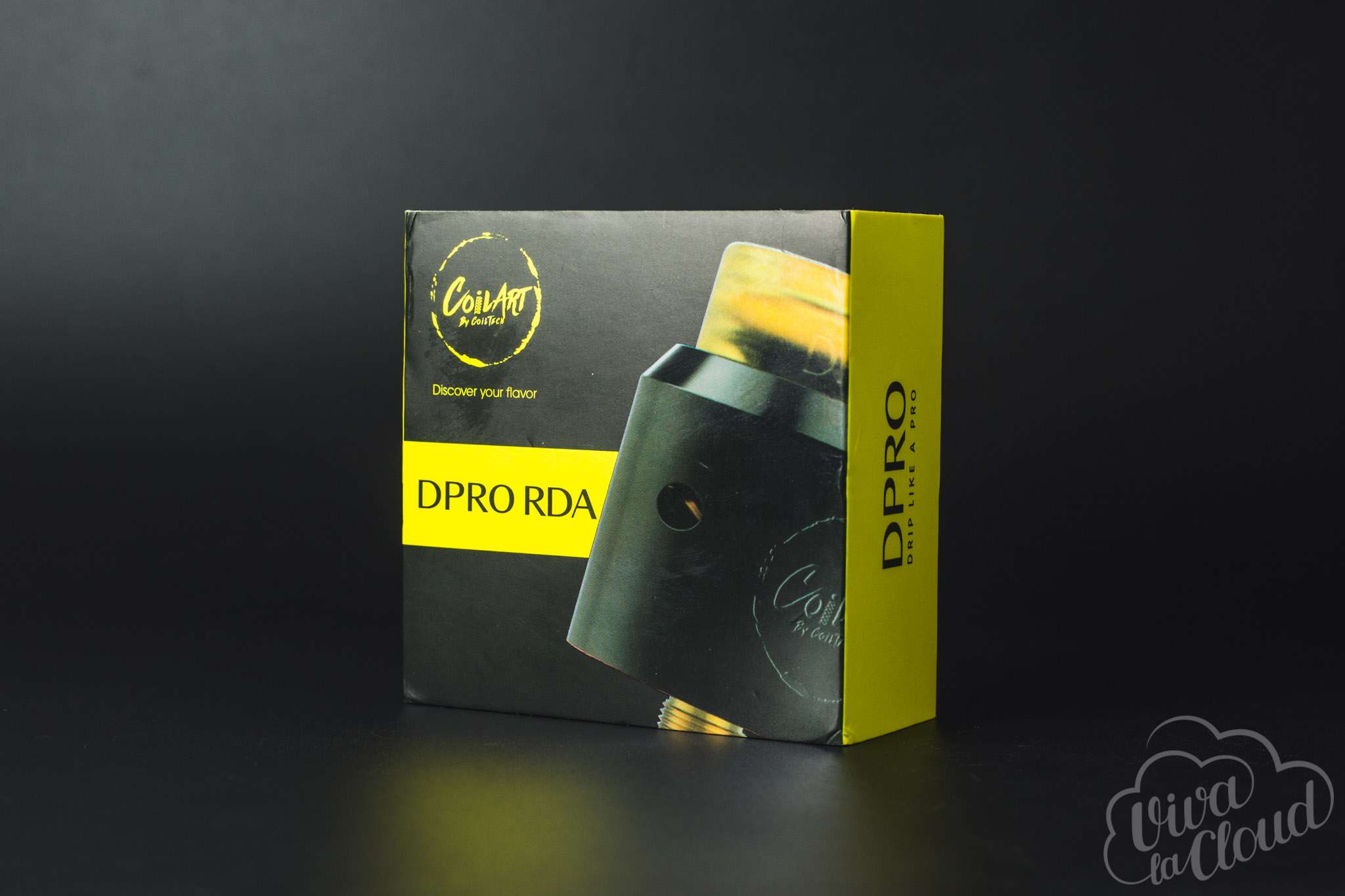 DPRO RDA — дрипка с позолоченной бесстоечной базой. Обдув здесь боковой, но направленный вниз — таким образом сами спирали обдуваются снизу. Обдув можно регулировать поворотом топкепа, который имеет внутреннюю сферическую обработку. На внешней стороне топкепа выгравирован логотип компании «Coilart».
