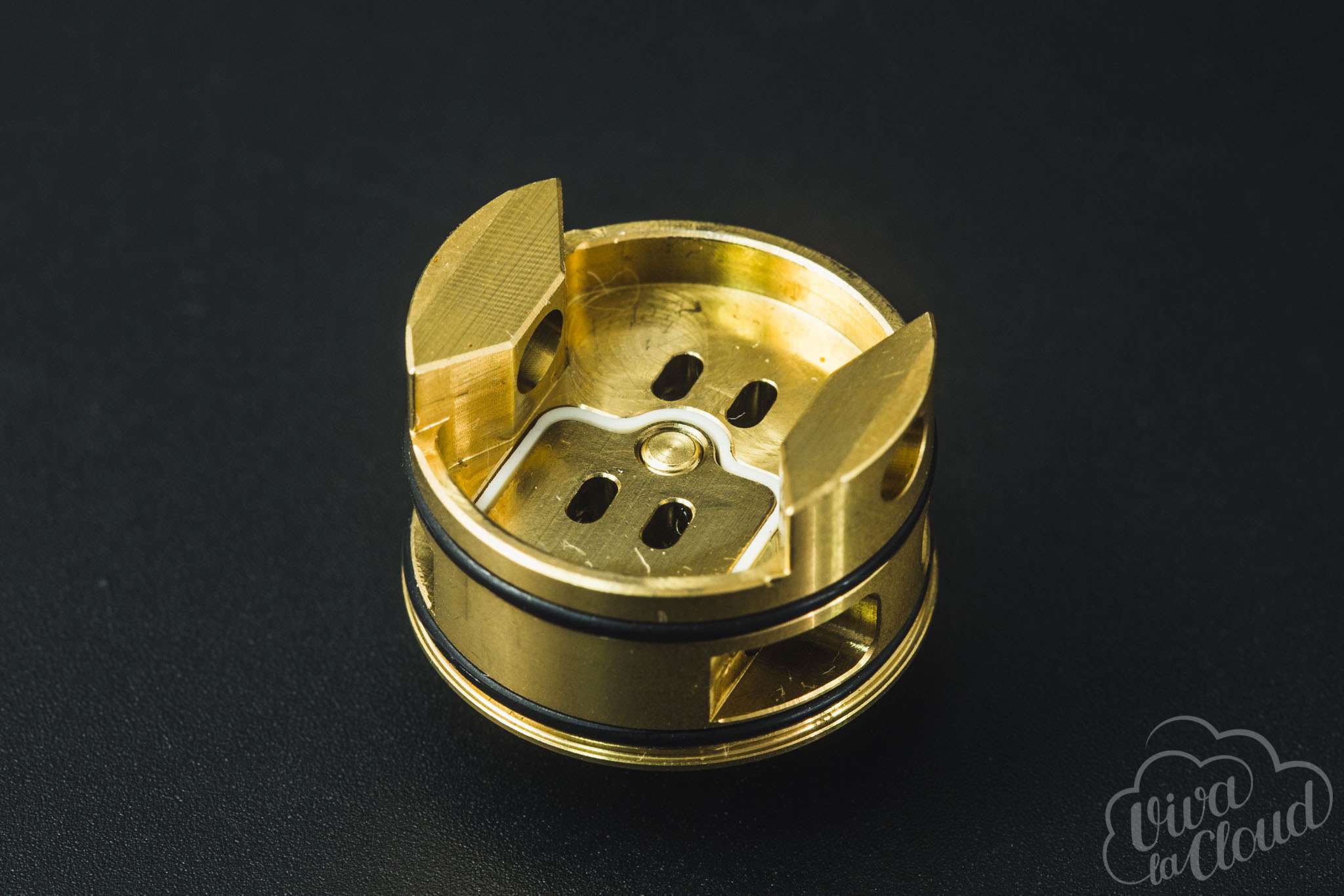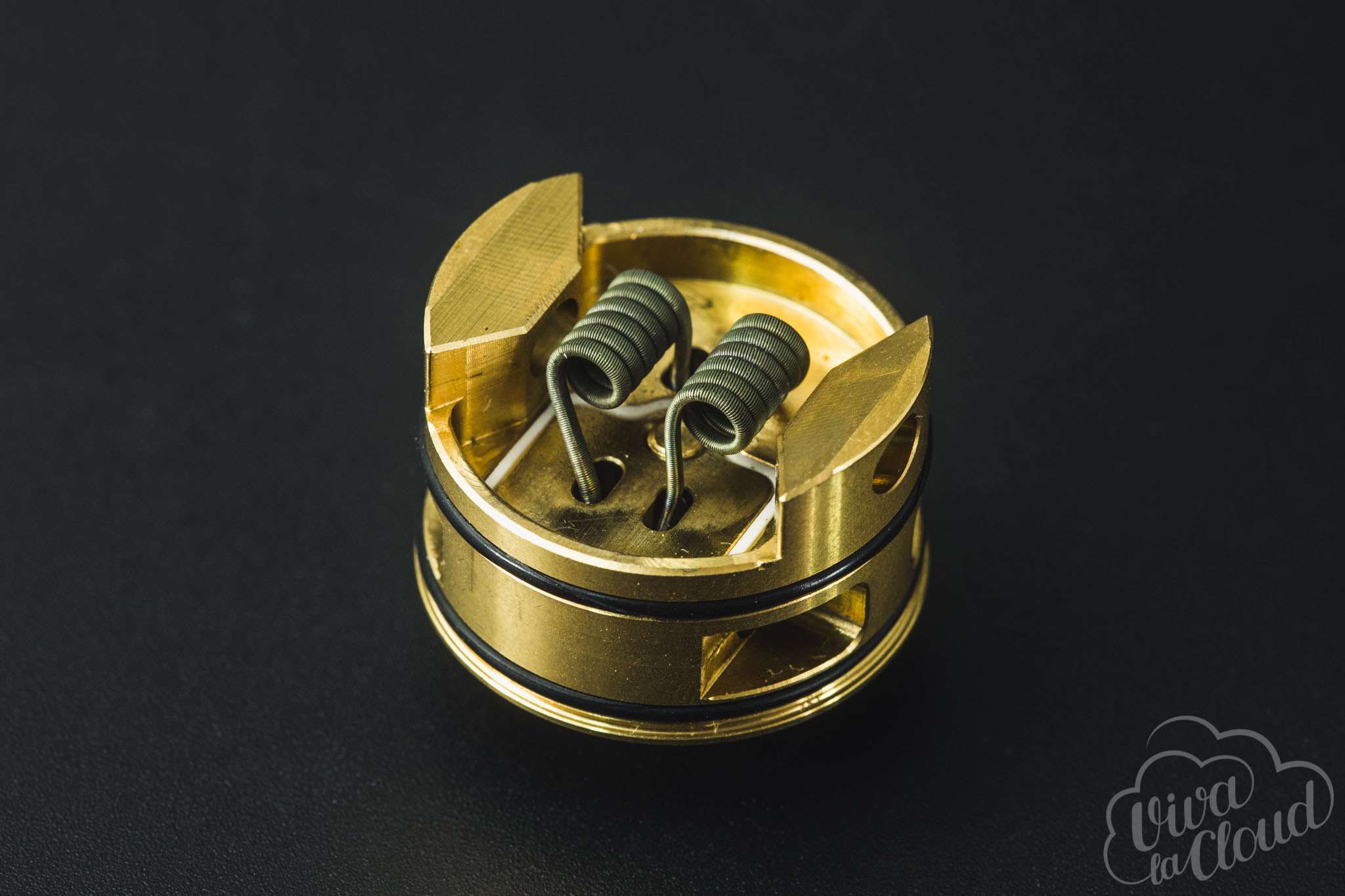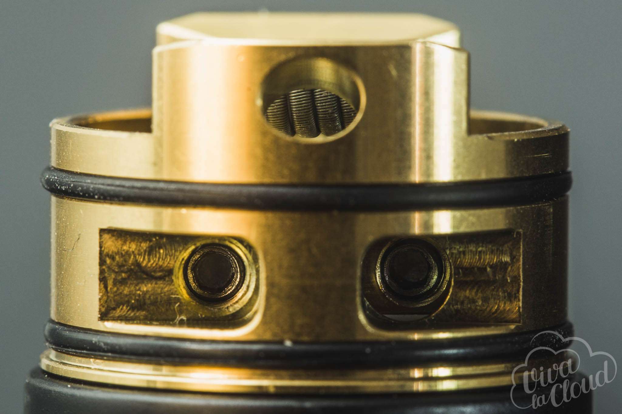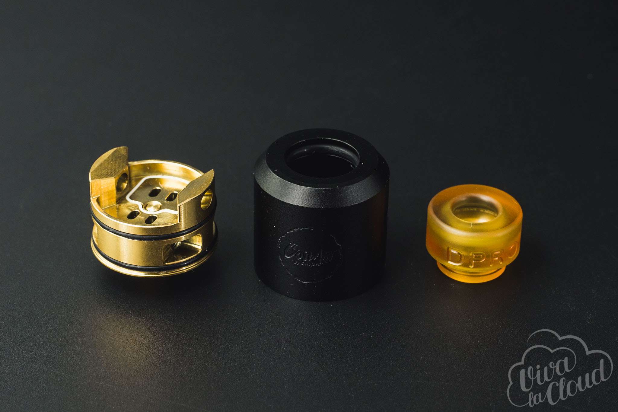 DPRO RDA — дрипка с позолоченной бесстоечной базой. Обдув здесь боковой, но направленный вниз — таким образом сами спирали обдуваются снизу. Обдув можно регулировать поворотом топкепа, который имеет внутреннюю сферическую обработку. На внешней стороне топкепа выгравирован логотип компании «Coilart».