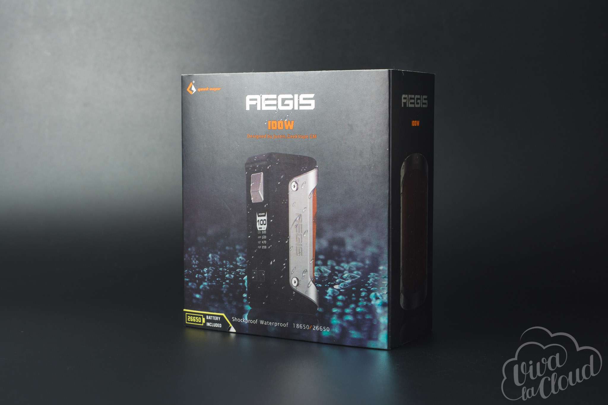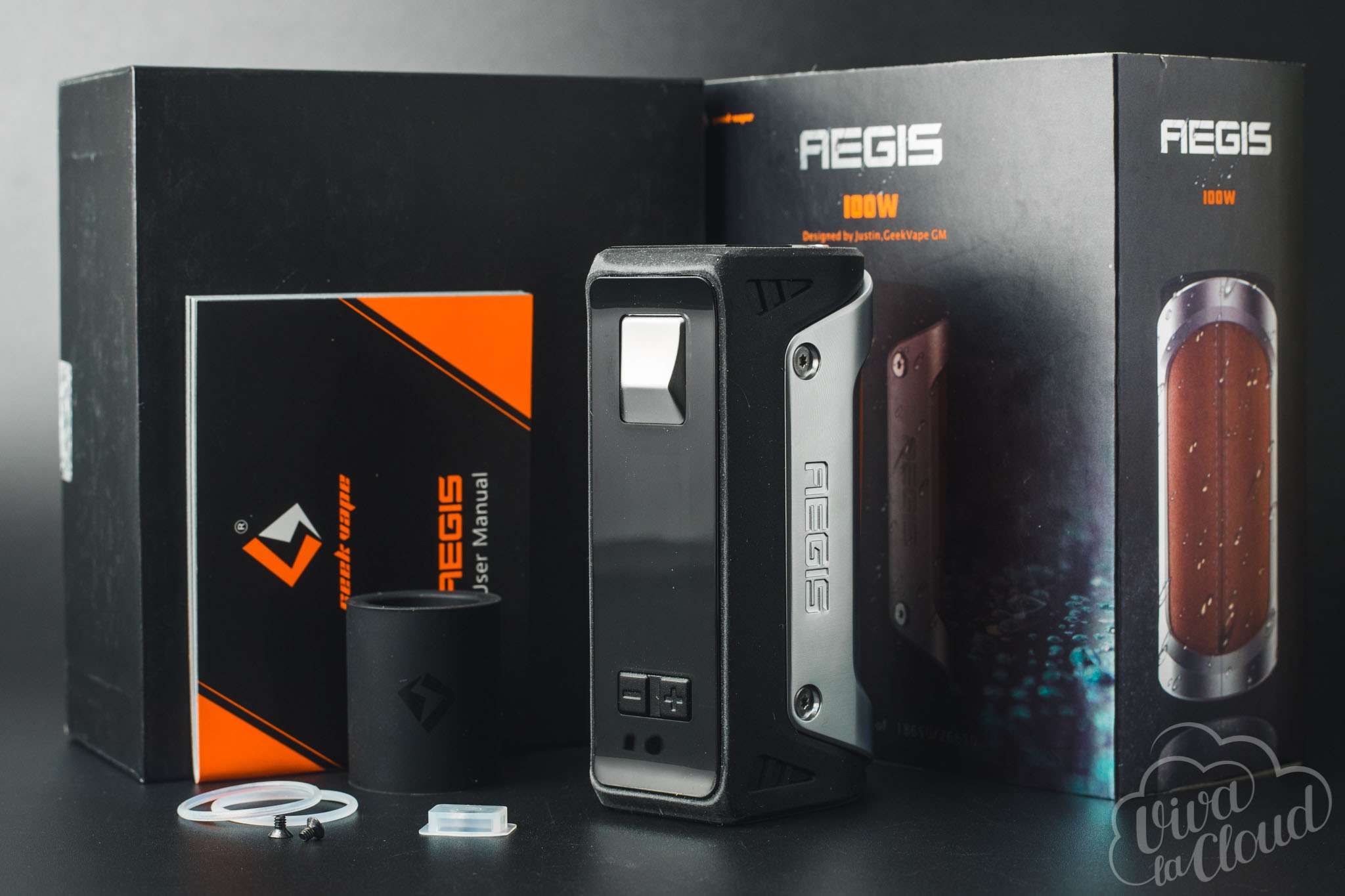 Приезжает Geekvape Aegis в черной коробке, на которую надет картонный рукав. Внутри все стандартно: подставка, коробочка с дополнительными уплотнителями, адаптер под аккумуляторы 18650, инструкция.