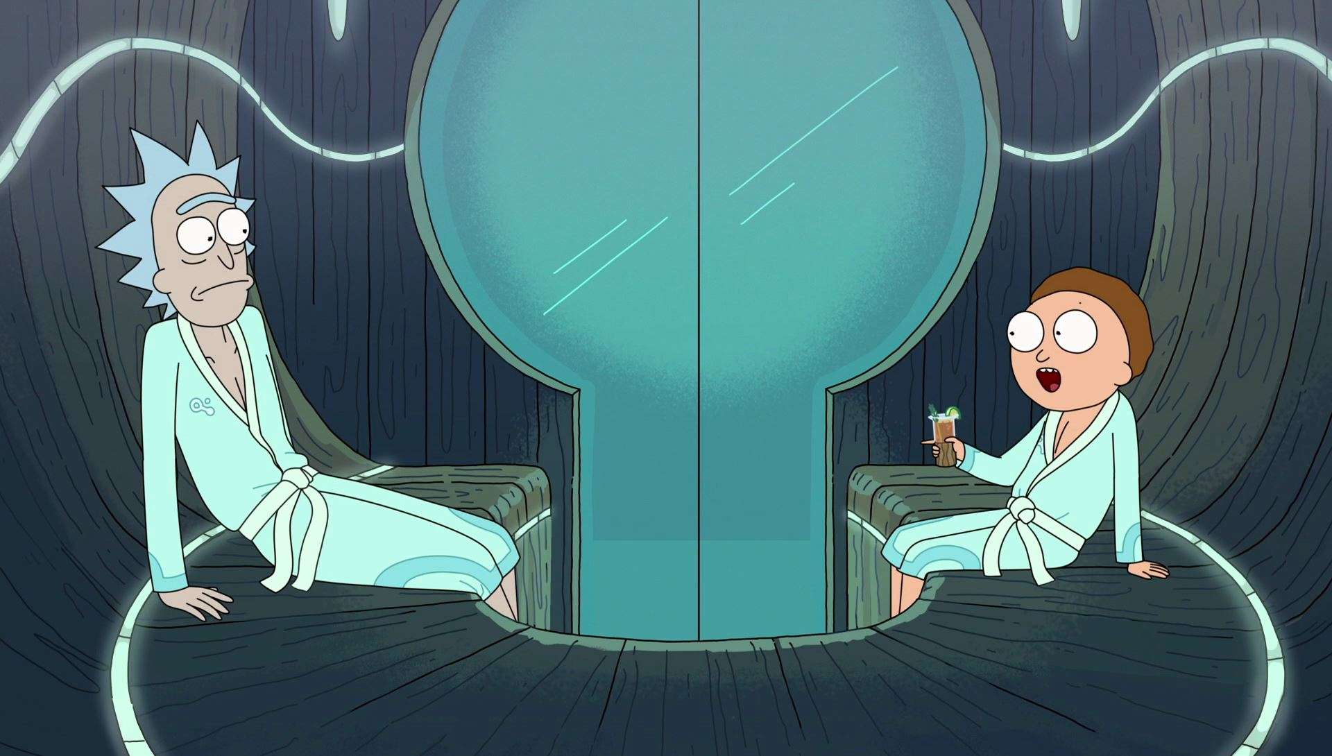 «Рик и Морти», о чудо, лишен каких-либо переживаний и терзаний о семье в новом эпизоде. Никакого ноющего Джерри, никакой язвящей Бет. Самое обычное (в хорошем, конечно, смысле) приключение Рика и Морти. Персонажи за минуту хронометража переживают космическую баталию, а затем вполне резонно отправляются отдыхать в спа-центр. Визит в него, разумеется, оборачивается очередной дичью: Рик и Морти делятся надвое. Первые два — слушают музыку в машине Рика, радуются жизни и, кажется, не рвутся на поиски новых приключений. Другие — попадают в мир токсинов, обильно ругаются и ненавидят себя.