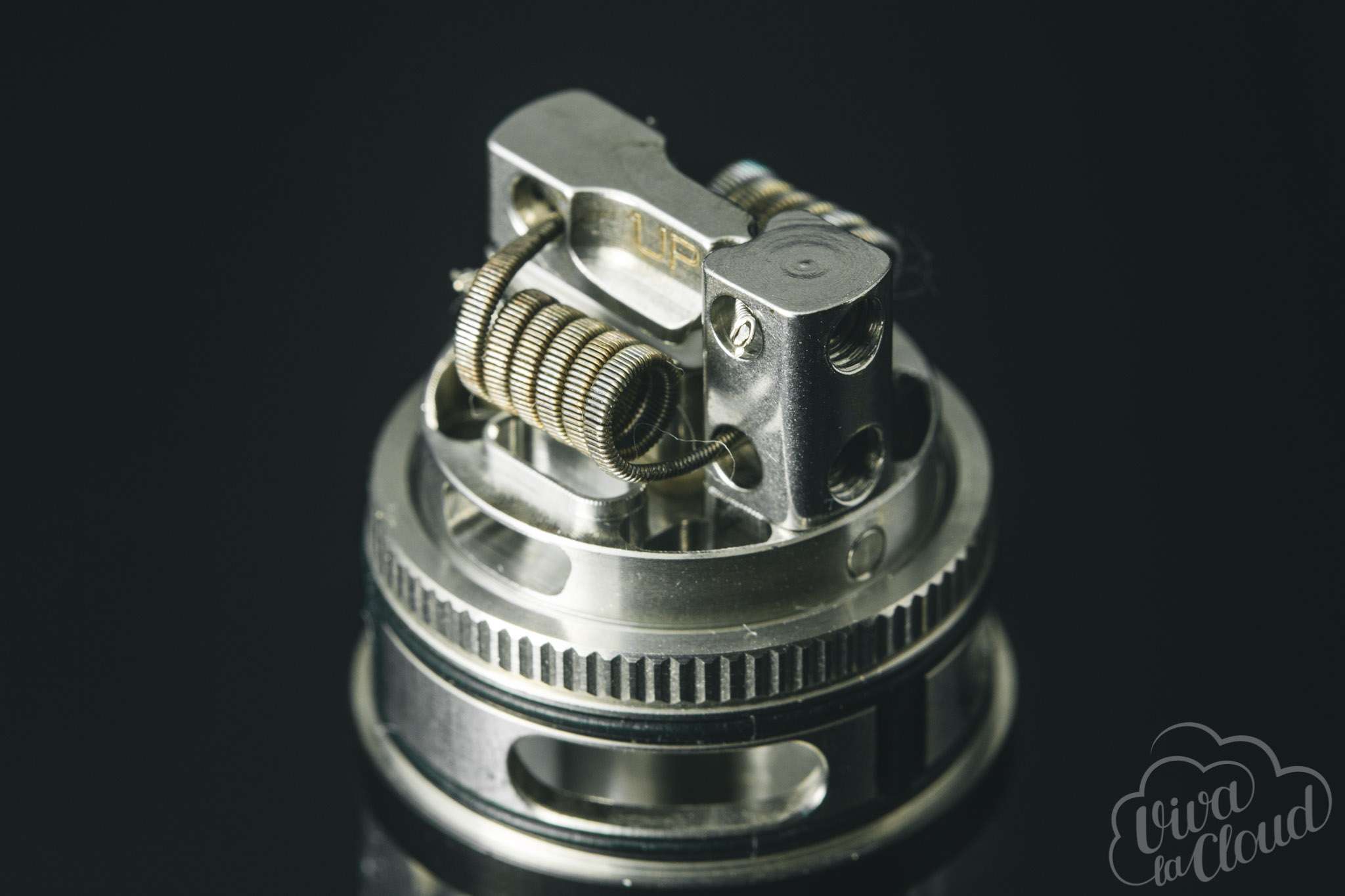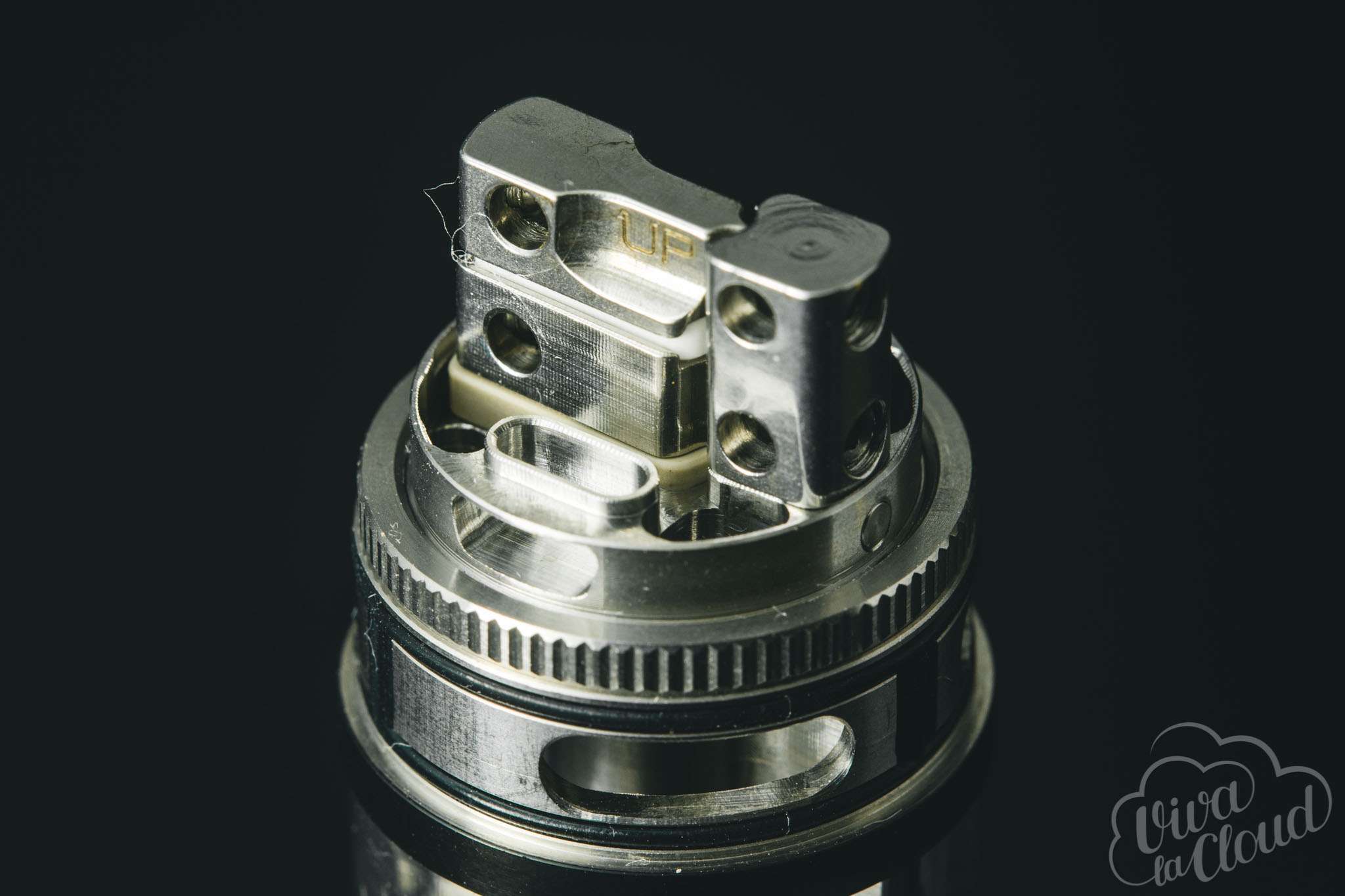Внутри Fusion Kit установлены две платы, которые работают независимо — пользователь может настраивать режимы, мощности и т. д. для каждой спирали по отдельности. Подача тока реализована через систему с двойным плюсовым пином, а на самом баке, чтобы пользователь не запутался, на стойках и внешней стороне бака указаны обозначения «UP» и «DOWN». Они отражают, какая качелька что регулирует. Однако если пользователю это всё неинтересно, пин бака можно заменить на обыкновенный — в таком случае придется отключить одну из плат.