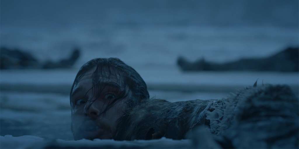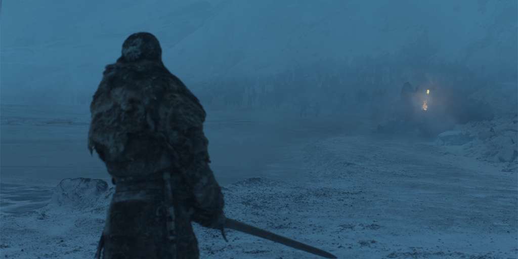 Джон Сноу отстаёт, покойники хватают его за ноги и тащат под лед. Он убивает врагов в воде и выныривает, по-прежнему окруженный группой трупов. И вдруг — неожиданно для всех — из-за сугроба выскакивает какой-то чувак на коне, крошит зомби огненным кадилом, спасает Джона Сноу — и пропадает. О напряжении, сами видите, говорить не приходится.
