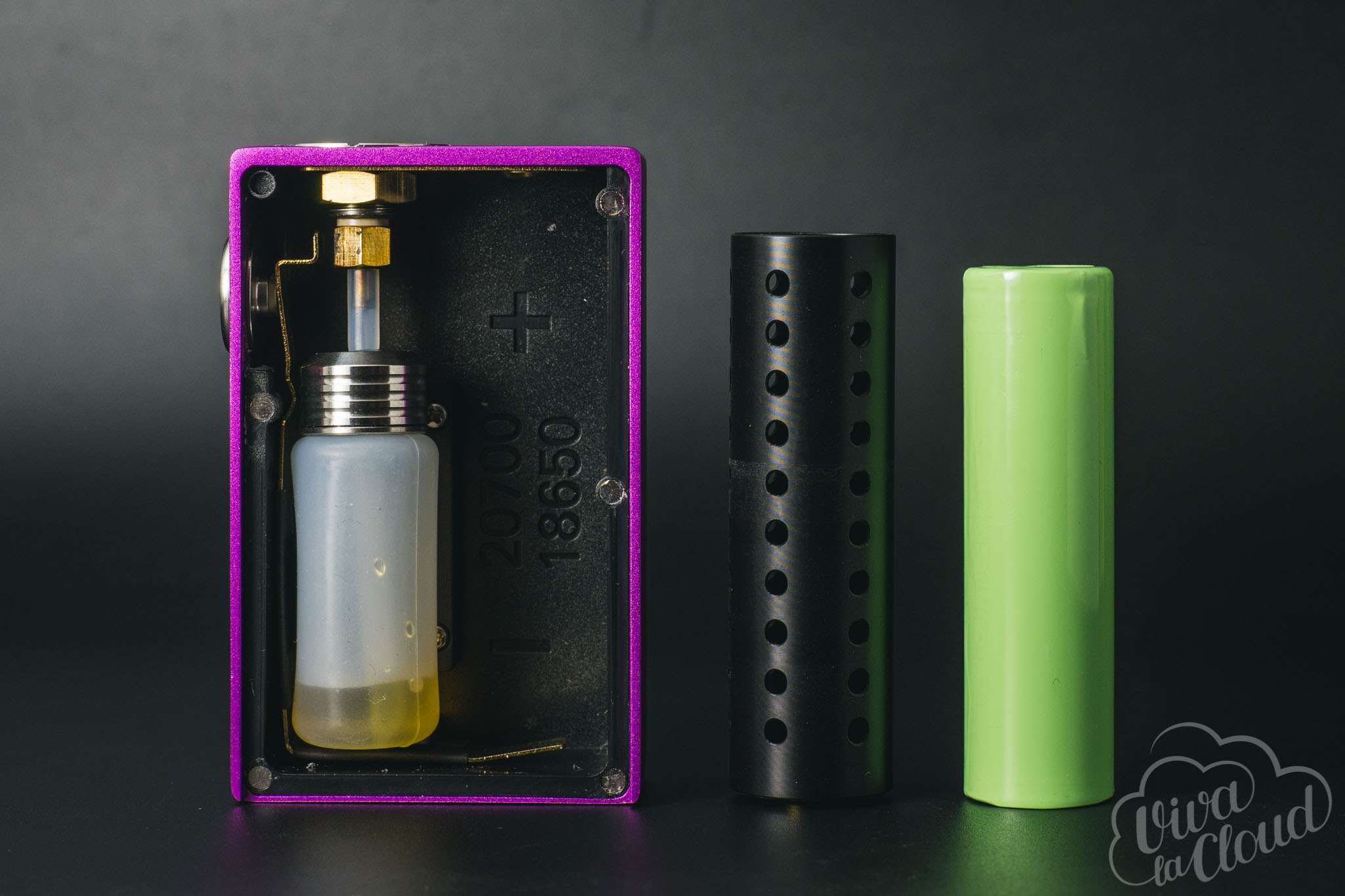 Боксмод работает от аккумуляторов 20700 и 18650. Во втором случае приходится использовать переходник. Минус в том, что аккумулятор слабо держится на месте и, если снять крышку и перевернуть боксмод, аккумулятор вывалится. Из-за этого присутствуют и проблемы с производительностью.