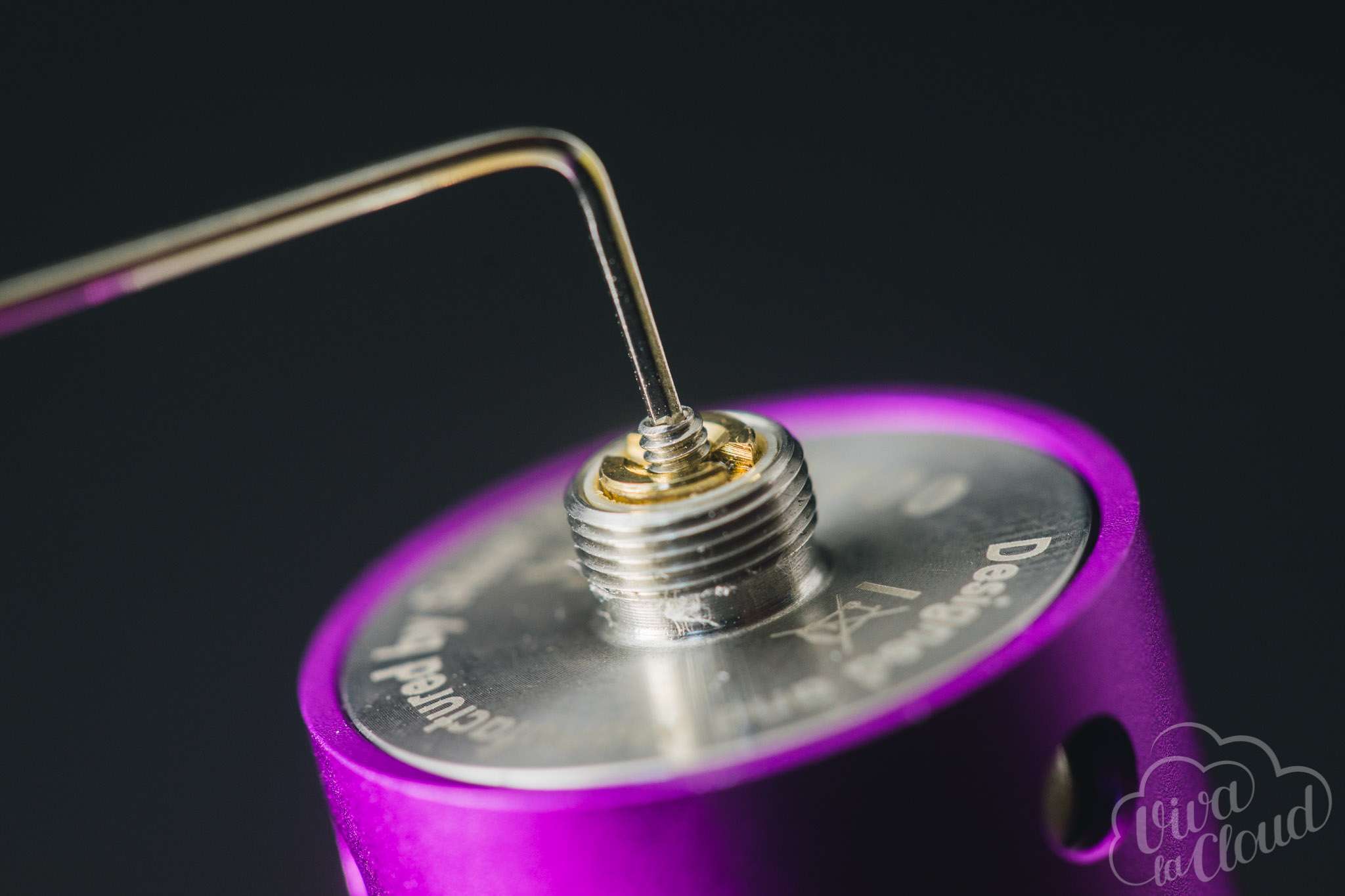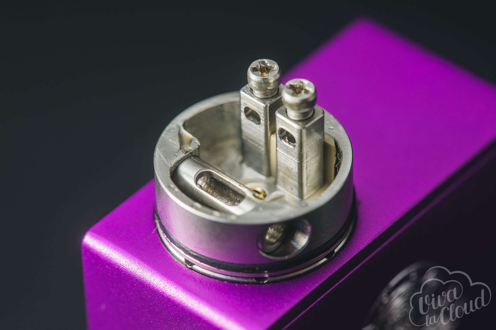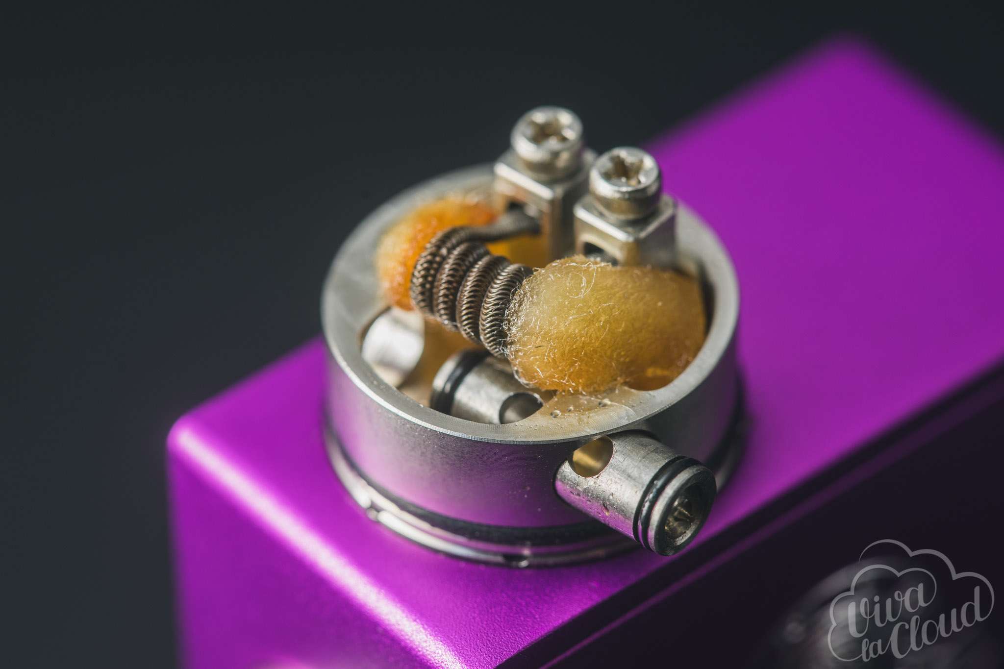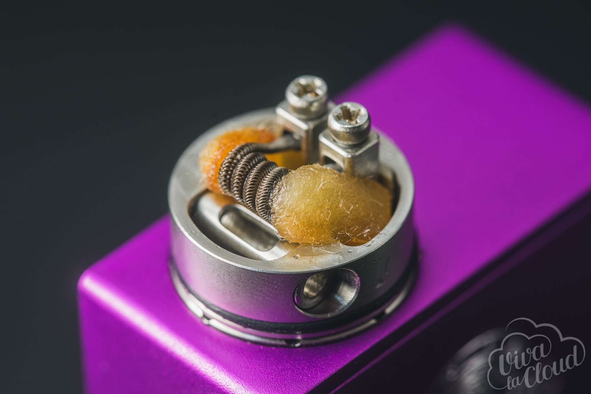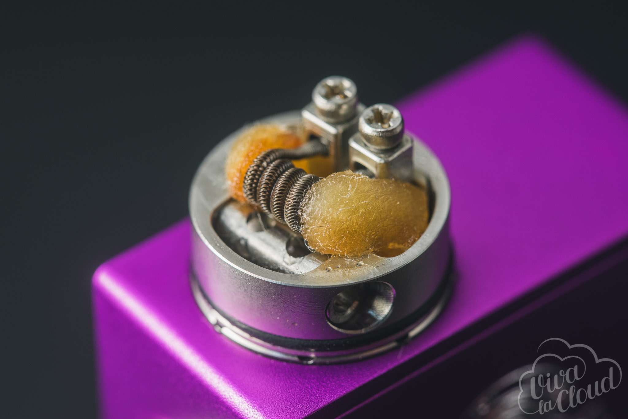 Про комплектный атомайзер много говорить не имеет смысла — он ничем не выделяется. База под одну спираль и нижний обдув, напоминающий Aeronaut RDA. Обдув регулируется и при необходимости может быть заменен на «точечный». У атомайзера очень низкая вкусопередача, а нижний обдув подтекает.