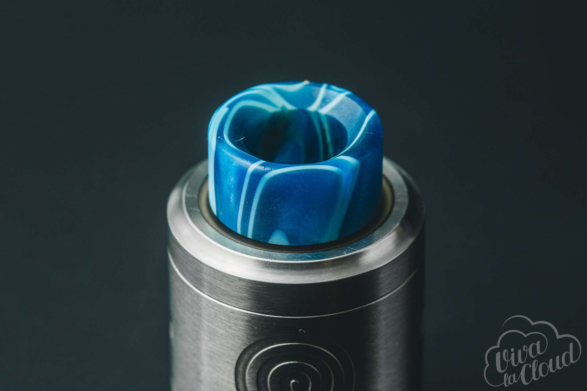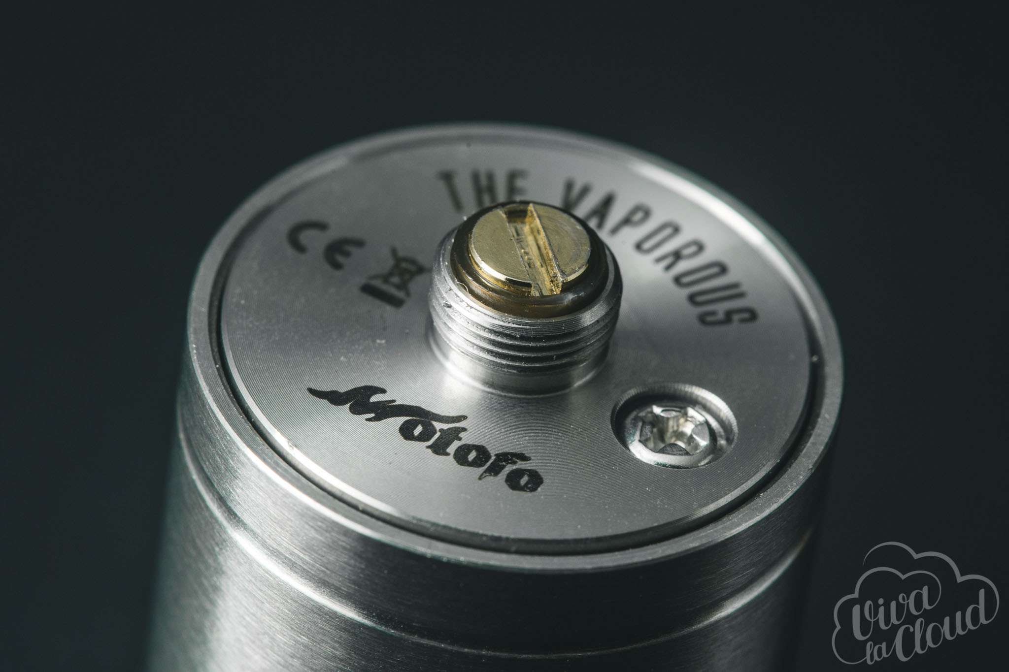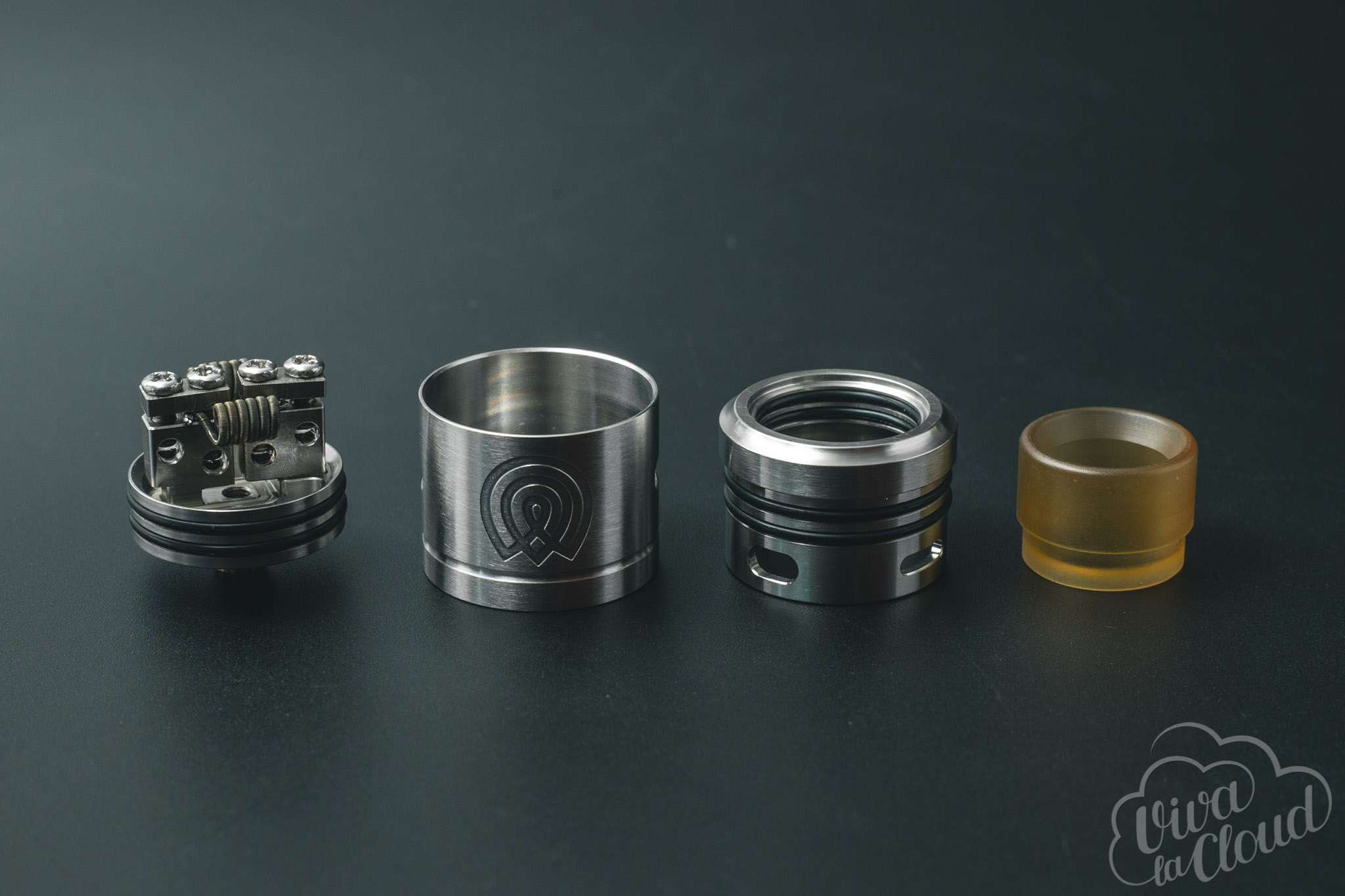 The Vaporous RDA выглядит достаточно сдержано. Единственный декоративный элемент — скромная гравировка на боку. Изначально на дрипку установлен очень широкий пластиковый дриптип. В комплекте есть переходник для обычных 810-х дриптипов, он в комплекте их не дают.