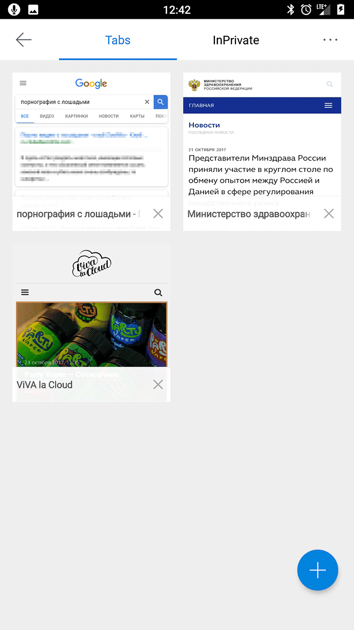 Вкладки и система их управления подчистую «слизаны» у Opera. В нижнем меню есть иконка — по клику открывается специальное меню, где показаны все открытые страницы — они закрываются со свайпом. Оттуда же доступен инкогнито-режим, функционирующий по тем же законам. Иконка в меню, однако, не показывает количества открытых вкладок — запутаться в происходящем легче легкого. Да и в целом такой подход проигрывает Google Chrome — там пульт управления вкладками вызывается и по клику, и по свайпу — при быстром серфинге это гораздо удобнее.