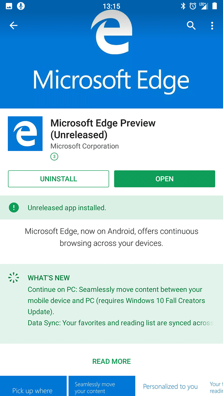 Microsoft выпустили на Android браузер Edge. Это адаптация компьютерного браузера под смартфоны. Приложение, насколько можно судить, доступно только участником Insider-программы Microsoft: скачать его свободно нельзя. К моменту написания заметки его, по данным Google Play, установили более 100 000 человек, но комментариев не оставили: магазин приложений запрещает оценивать невыпущенный в открытый доступ софт.