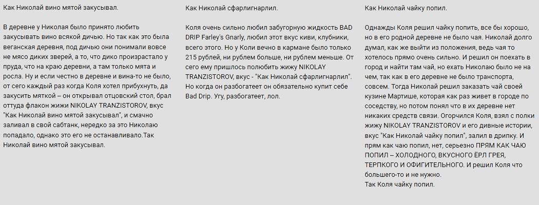 В саратовском вейпшопе Cloudy появилась жидкость «Николай Транзисторов». Она стоит 215 рублей за 100 миллилитров. Ее создали сотрудники магазина, чтобы бороться «с лютым демпингом конкурентов», рассказал ViVA la Cloud один из партнеров, представившийся как Виктор Говнов. «Все думали, что при такой цене если в банку нассут — и то норма, а тут прям амброзия», — объяснил он успех «Николая».