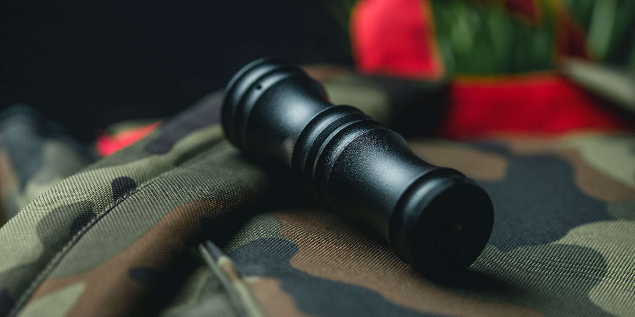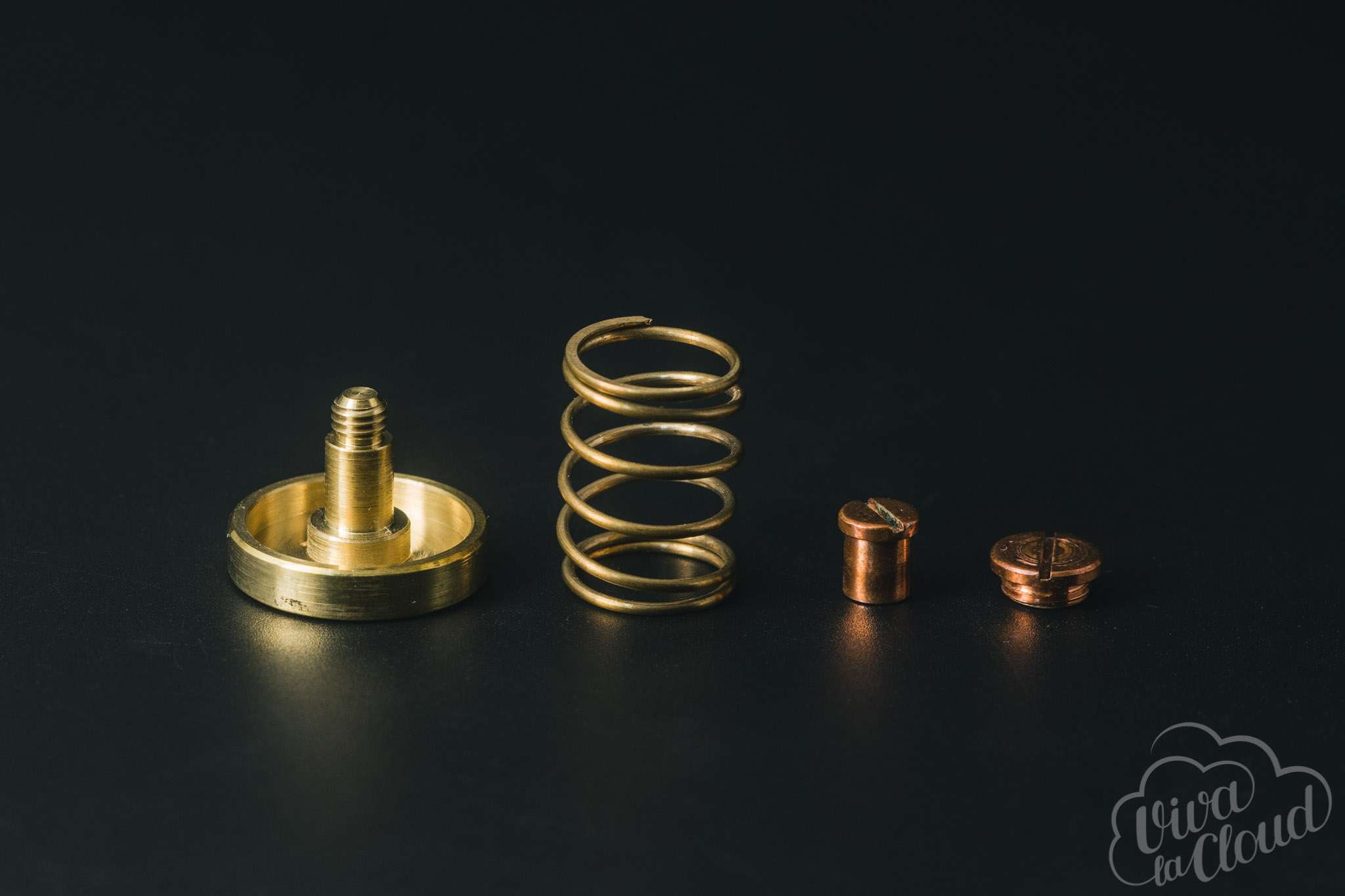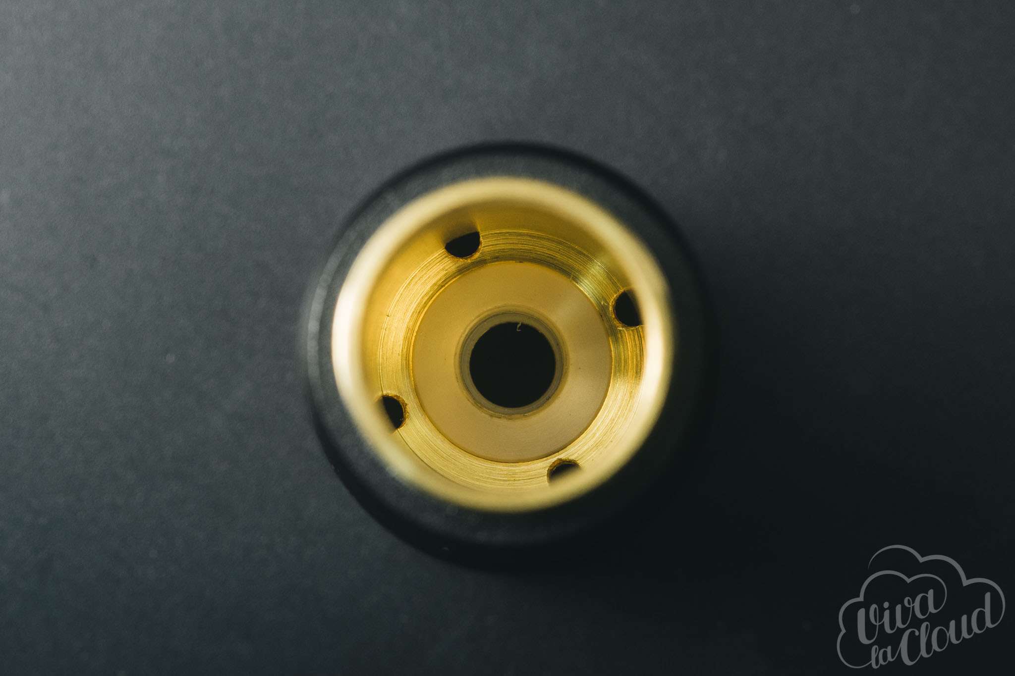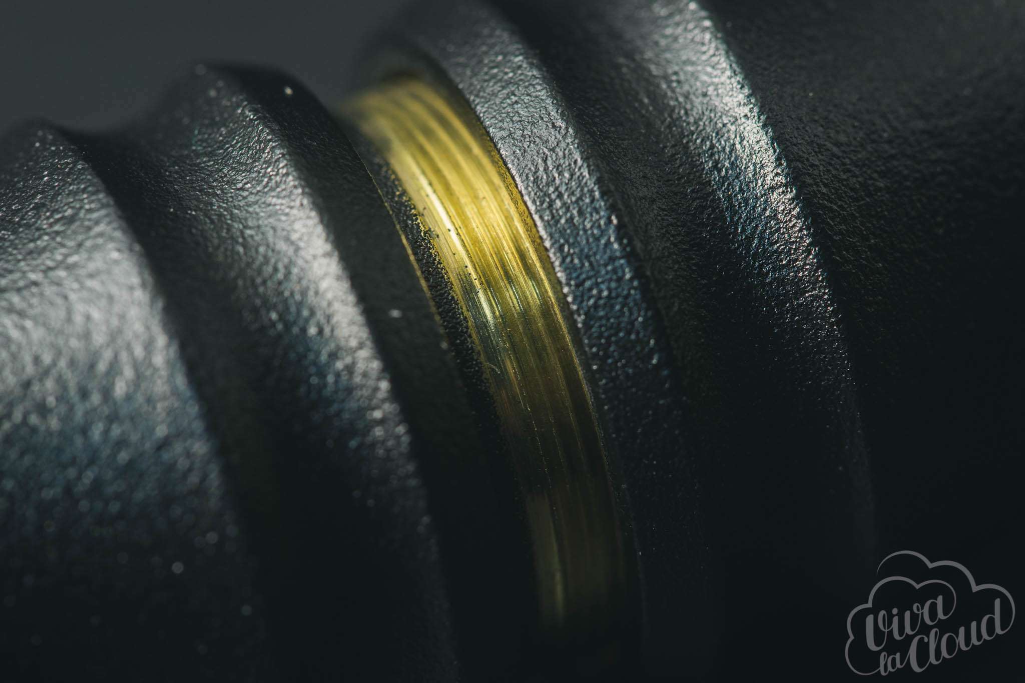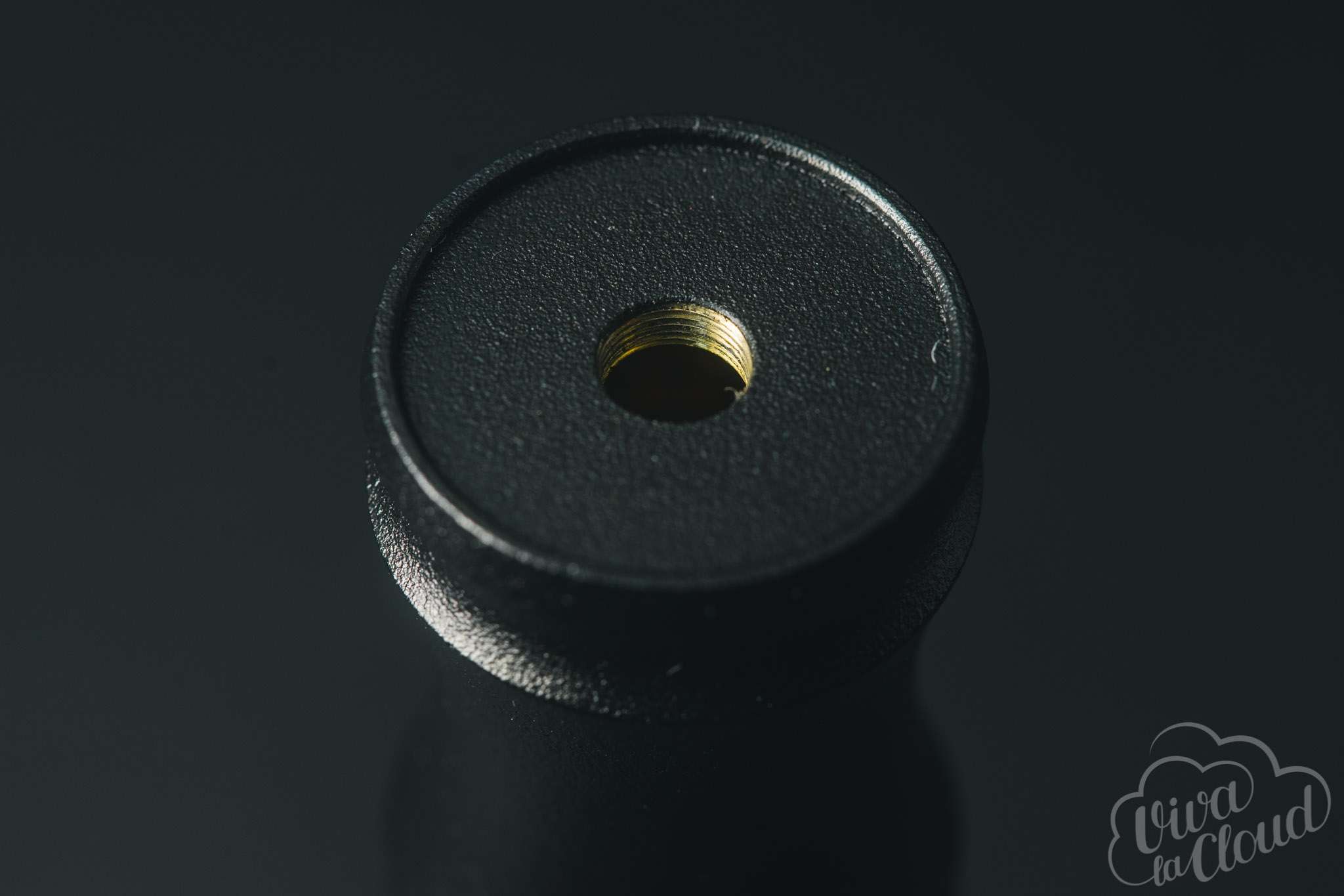 Кнопка ДНРа обладает системой постоянного контакта. В тело трубы установлен изолятор с резьбой, в который вкручен небольшой винт — он же промежуточный пин. Пружина кнопки, судя по виду, сделана из бронзы или схожего материала. Она довольно большая, в меру мягкая и невероятно приятная. Примерно там же размещены отверстия вывода газов. Аккумулятор, соответственно, следует устанавливать пином вниз — в случае проблем эпицентр не будет находиться у лица пользователя.