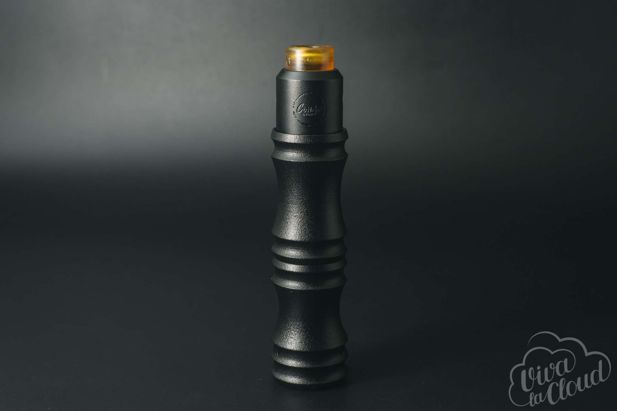 Глупо отрицать внешнее и конструктивное сходство ДНР с Bane от H-Stone. Мод, впрочем, остается весьма самобытным — и внешне напоминает шахматную фигуру, вырезанную из массива дерева. Из-за этого он очень удобно лежит в руке — девайс комфортно держать и нижним, и верхним хватами. На площадке под атомайзер есть небольшой бортик — благодаря ему сетап с атомайзерами диаметром 24 миллиметров смотрятся более монолитно. Дрипки на 25 миллиметров — Subzero X RDA и Kennedy 25 — тоже вполне неплохо работают с ДНР.