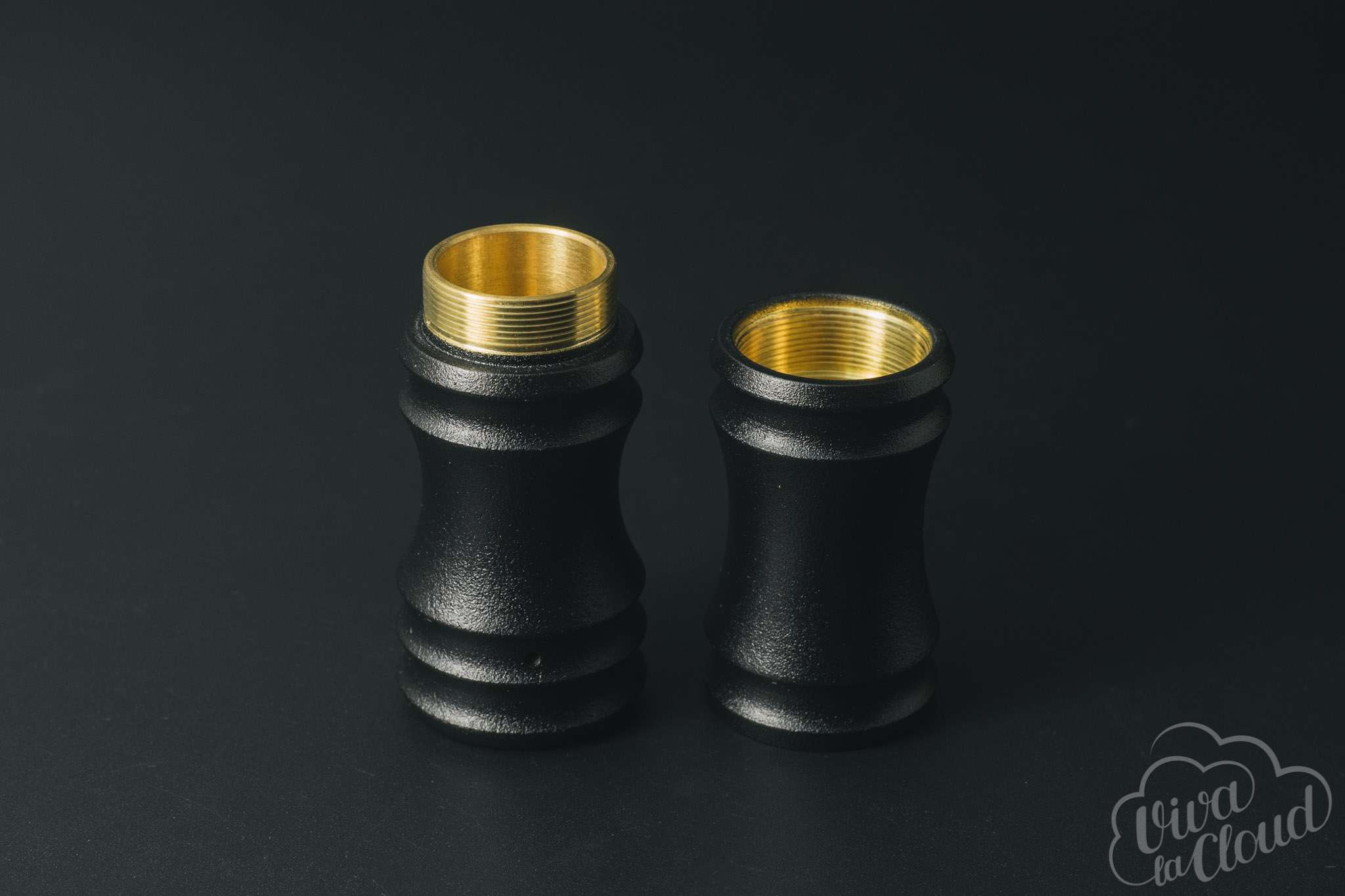 Посередине мода расположена резьба — так в ДНР меняются и подстраиваются аккумуляторы. Хорошо, что таким образом 18650-й никуда не вываливается, оставаясь в стакане. Однако плохо, что новички могут перетянуть резьбу и продавить и испортить батарею — и что при использовании ровно посередине мехмода остается щель.