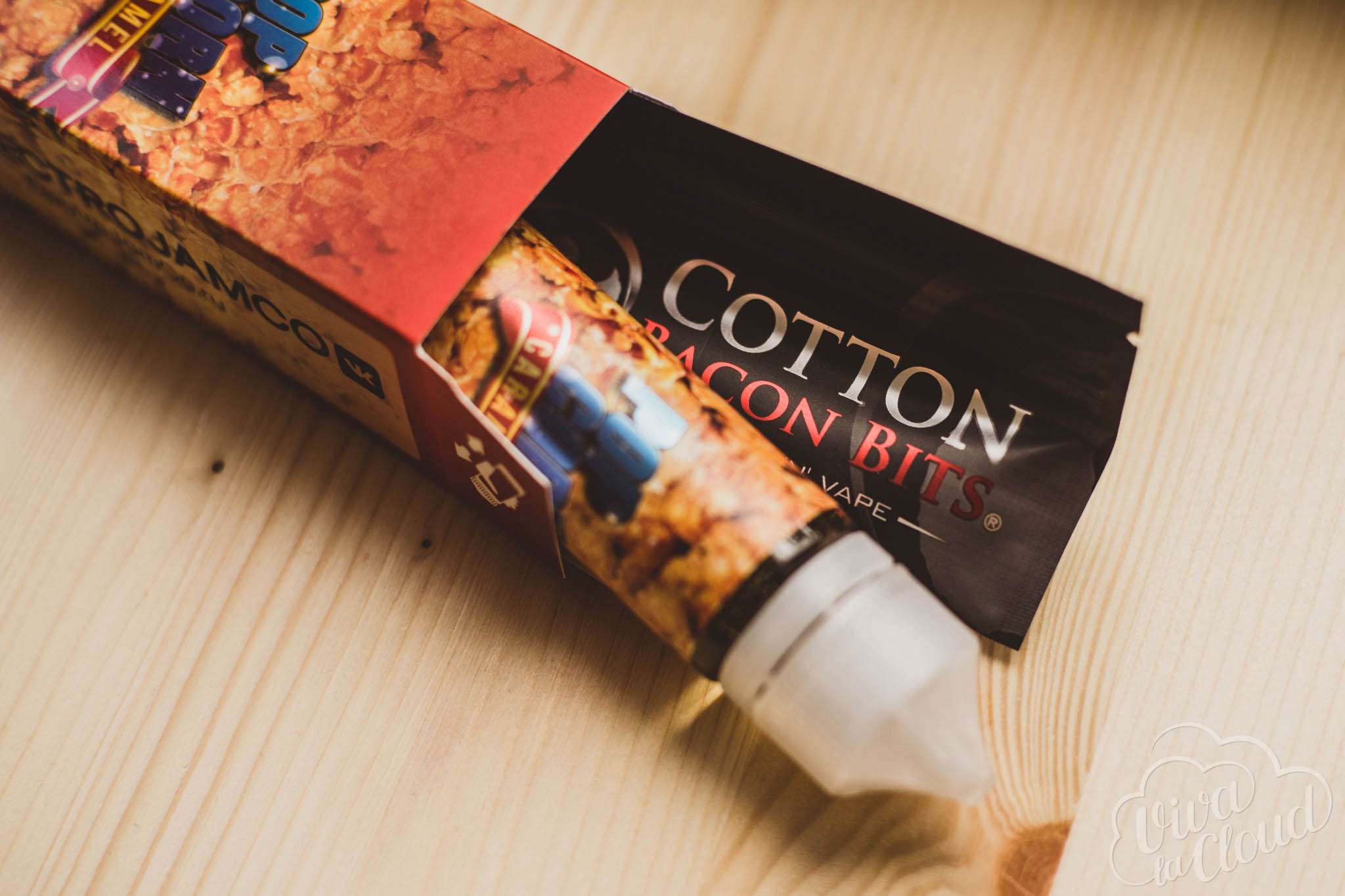 Внутри, помимо флакона, лежат маленькая упаковка хлопка Cotton Bacon и наклейка. Сам бутылек объемом 60 миллилитров имеет защиту от детей и контроль первого вскрытия. Матовая этикетка дублирует оформления коробки. Есть шкала, сообщающая об уровне оставшейся жидкости.