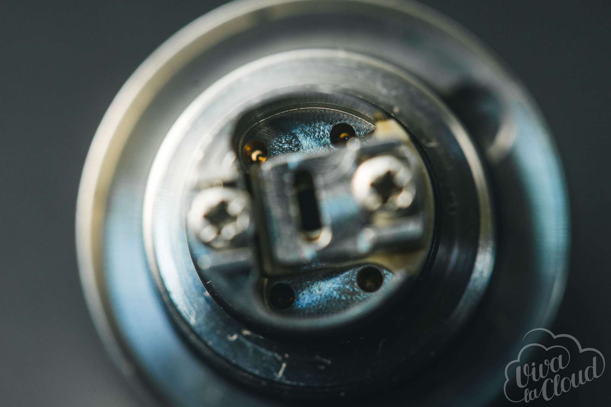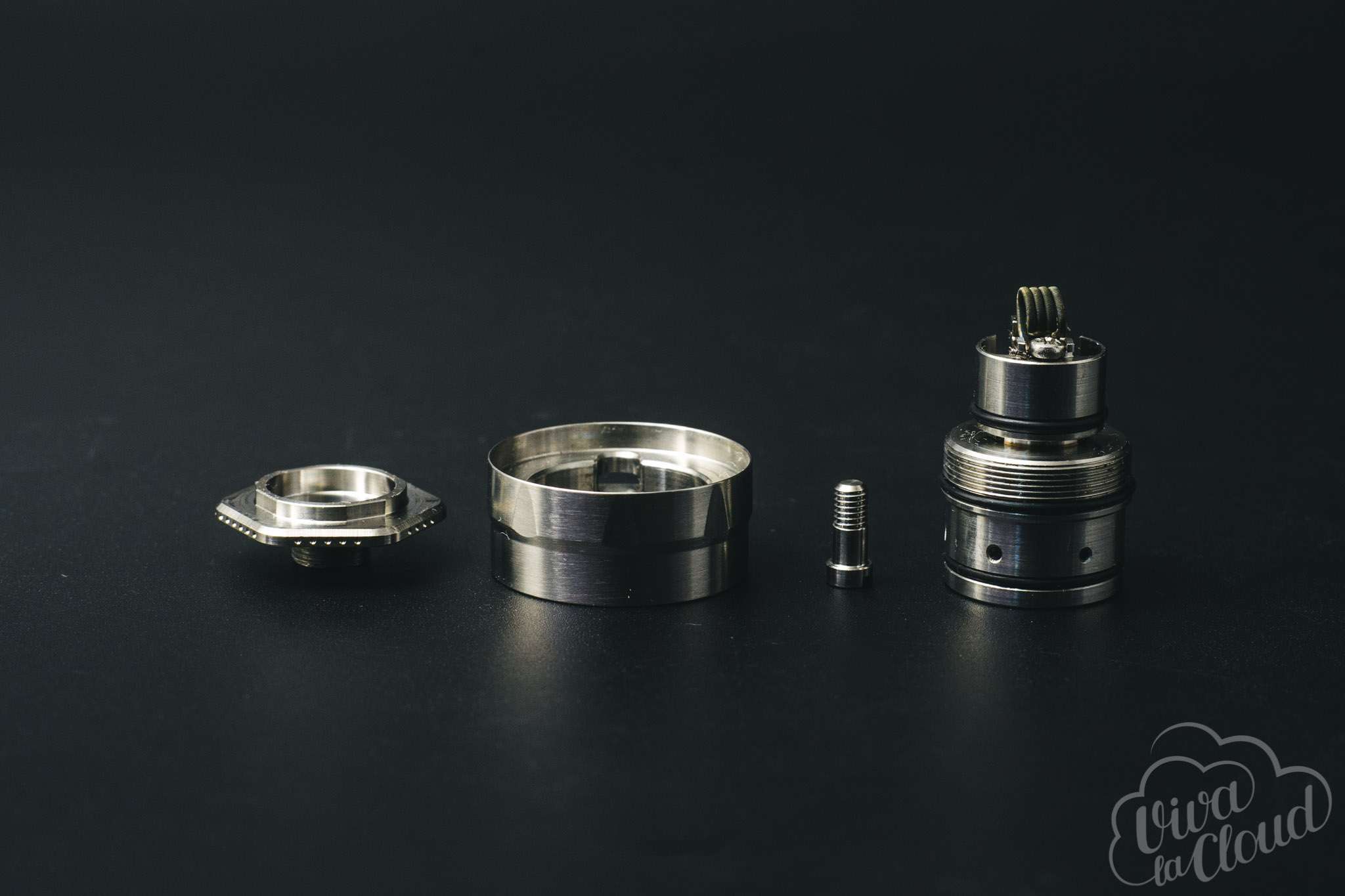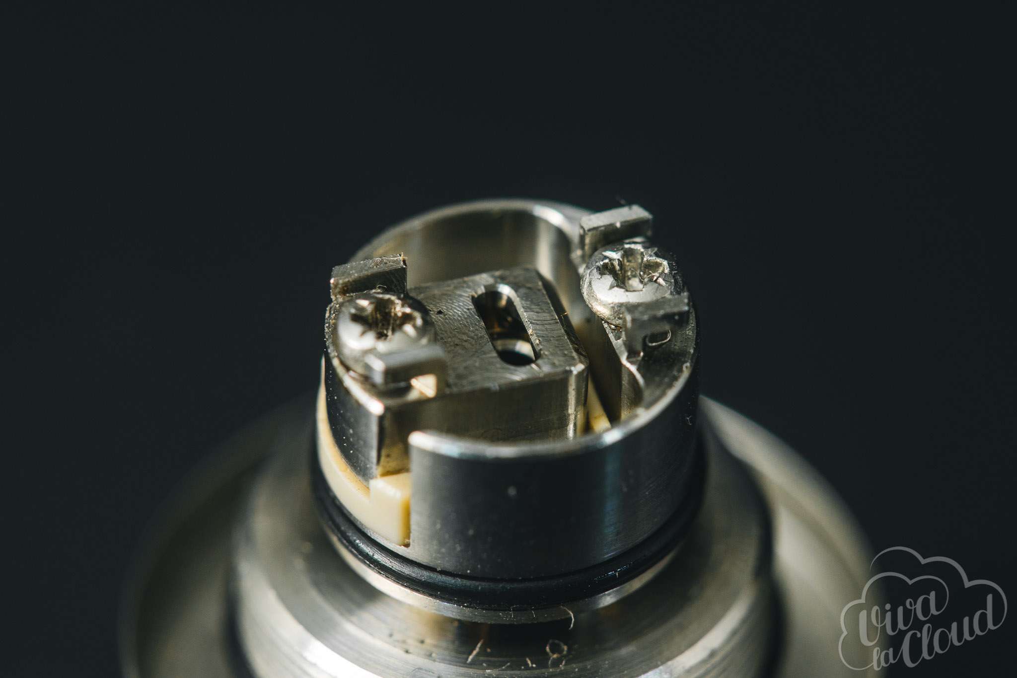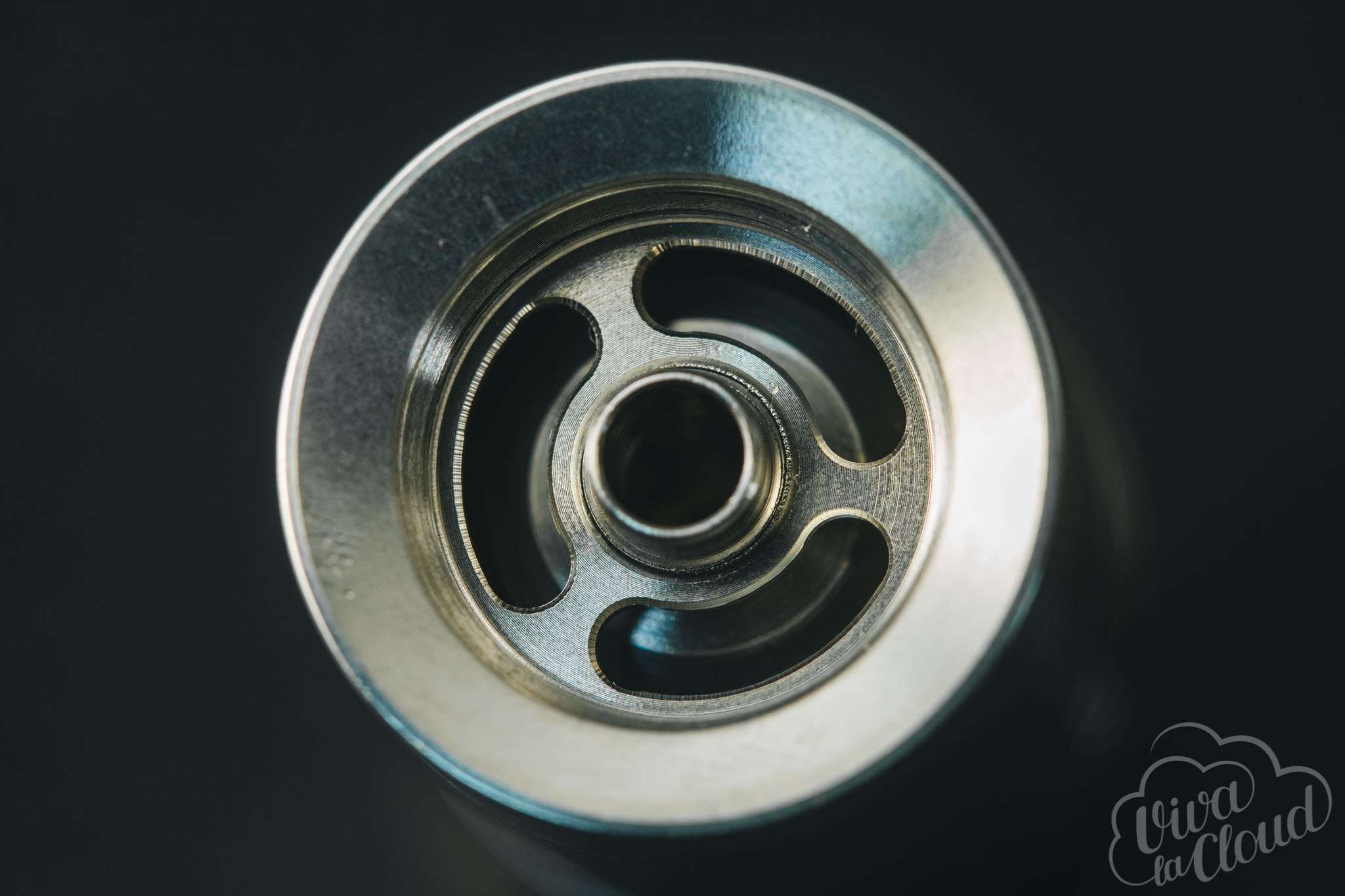 Обслуживать бак несложно. Тут 2 классических стойки с 4 каналами для подачи жидкости и специальными спилами, в которые следует загибать ножки спирали. Хлопок не нужно утрамбовывать во избежание проблем с подпиткой. Проблем доставить может разве что сборка в рабочее состояние — нужно совместить отверстия обдува с обозначениями на диске. Чтобы не ошибиться, поднимите кольцо регулировки обдува и слегка докрутите до него бак — в этом варианте жидкости будет поступать достаточно.