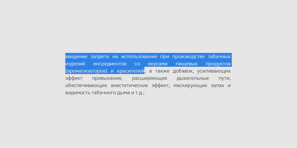 Конкретно об электронных сигаретах в Концепции почти ничего не говорится: словосочетание «электронные системы доставки никотина» встречается в документе всего трижды. Сначала — в контексте повышения акцизов до «среднего уровня стран» Европы. Затем — в запретительном ключе. Концепция предполагает следующие ограничения: