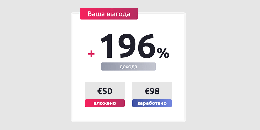 Relakes говорят о минимум 96-процентной доходности кампании. На сайте есть выбиралка — предположим, читатель инвестирует сейчас — вот сколько он получит. Самый пессимистичный вариант — вынет деньги через год. При таком раскладе, согласно математике Relakes, его «выгода» составит «+196% дохода». Дают пример — 50 евро вложено, 98 получено. 48 евро прибыли, однако, — никакие не 196 процентов, а всего-навсего 96.