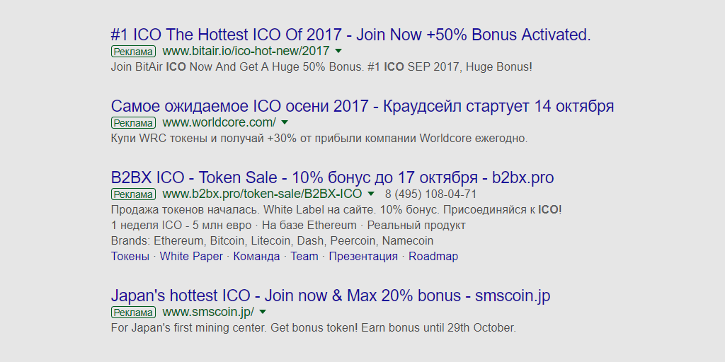 Если набрать «ICO» в «Гугле», первые 4 предложения окажутся контекстной рекламой. Судя по всему, это весьма действенный метод рекламы таких предприятий: именно её в первую очередь предлагают на «Биткоинтоке» и «Коссе». Но в поисковиках и соцсетях нельзя рекламировать вейпинг — это ViVA la Cloud выяснил еще в марте. Что в таких условиях намерены делать Relakes, неясно.