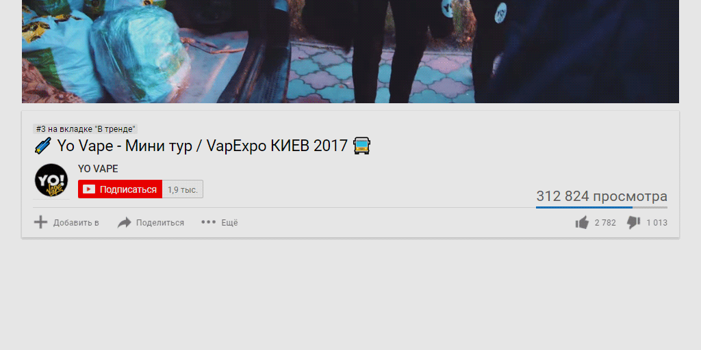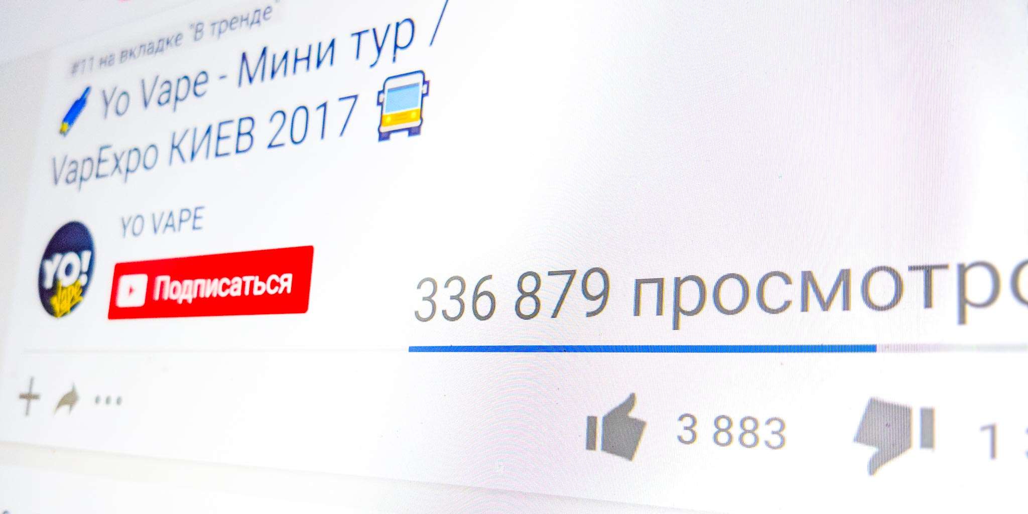 2 ноября в ютубе появился ролик «? Yo Vape — Мини тур / VapExpo КИЕВ 2017 ?». В нем представители производителя жидкости едут на VapExpo в Киеве и смотрят город. В ночь с 3 на 4 ноября автор ViVA la Cloud заметил это видео на 3 месте трендов ютуба. К тому моменту оно собрало 312 000 просмотров — сейчас счетчик увеличился до 337 тысяч зрителей, 3 900 лайков и 1 400 дизлайков. Другие (за исключением ролика о московской Vapexpo) видео Yo Vape не доходили и до 3 000 просмотров, а на самом канале на момент написания заметки было 2 тысяч подписчиков. Кроме того, в описании канала говорилось о 43 628 суммарных просмотрах.