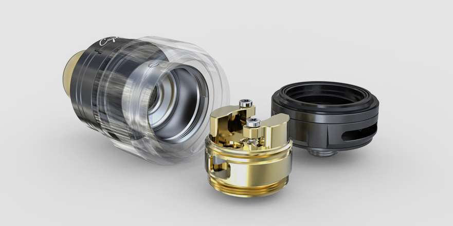 Объем Captain Elite RTA со стандартным стеклом равняется 2 миллилитрам (согласно TPD). Также пользователь может заменить обычную колбу на расширенную, тем самым увеличив объем до 3 миллилитров. Внутри у устройства находится позолоченная дека под одну спираль. Намотка обдувается через отверстия, которые находятся в стойках, а хлопок укладывается в «карманы». При желании, пользователь может выкрутить RBA-базу, а на ее место установить сменный испаритель.