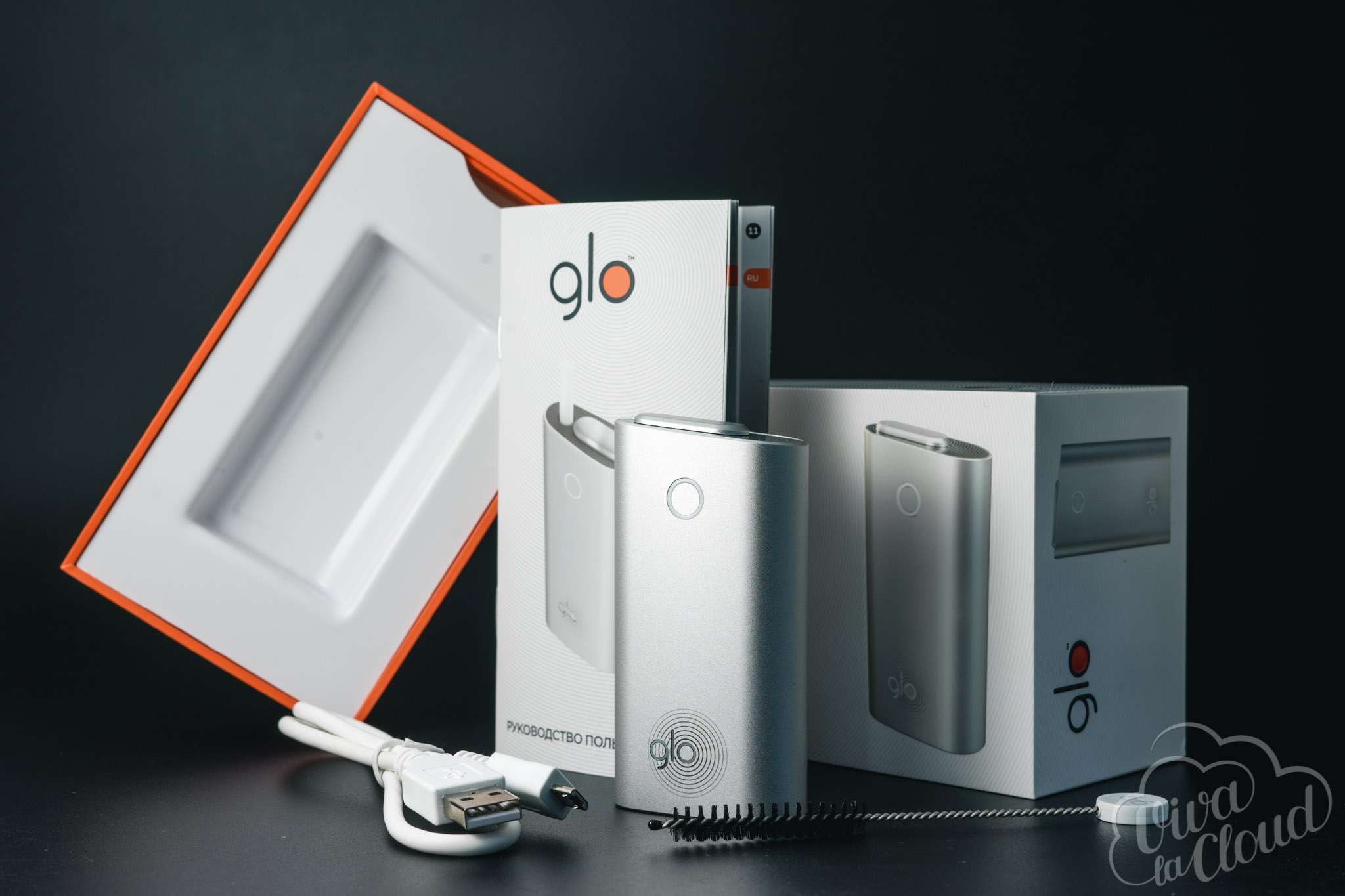 Комплектация проста — устройство, бумажки, провод и шомпол. USB-шнур на сайте устройства называют «специально спроектированным» для зарядки glo. Что неправда — это самый обычный USB не лучшего качества, будто купленный за полтинник на Митинском радиорынке. Шомпол гораздо более красив — в начале у него есть кружочек с логотипом. Жаль, он не нужен: инструкция говорит, что чистить девайс следует раз в 20 стиков, но я вот спарил в десять раз больше — и нормально.