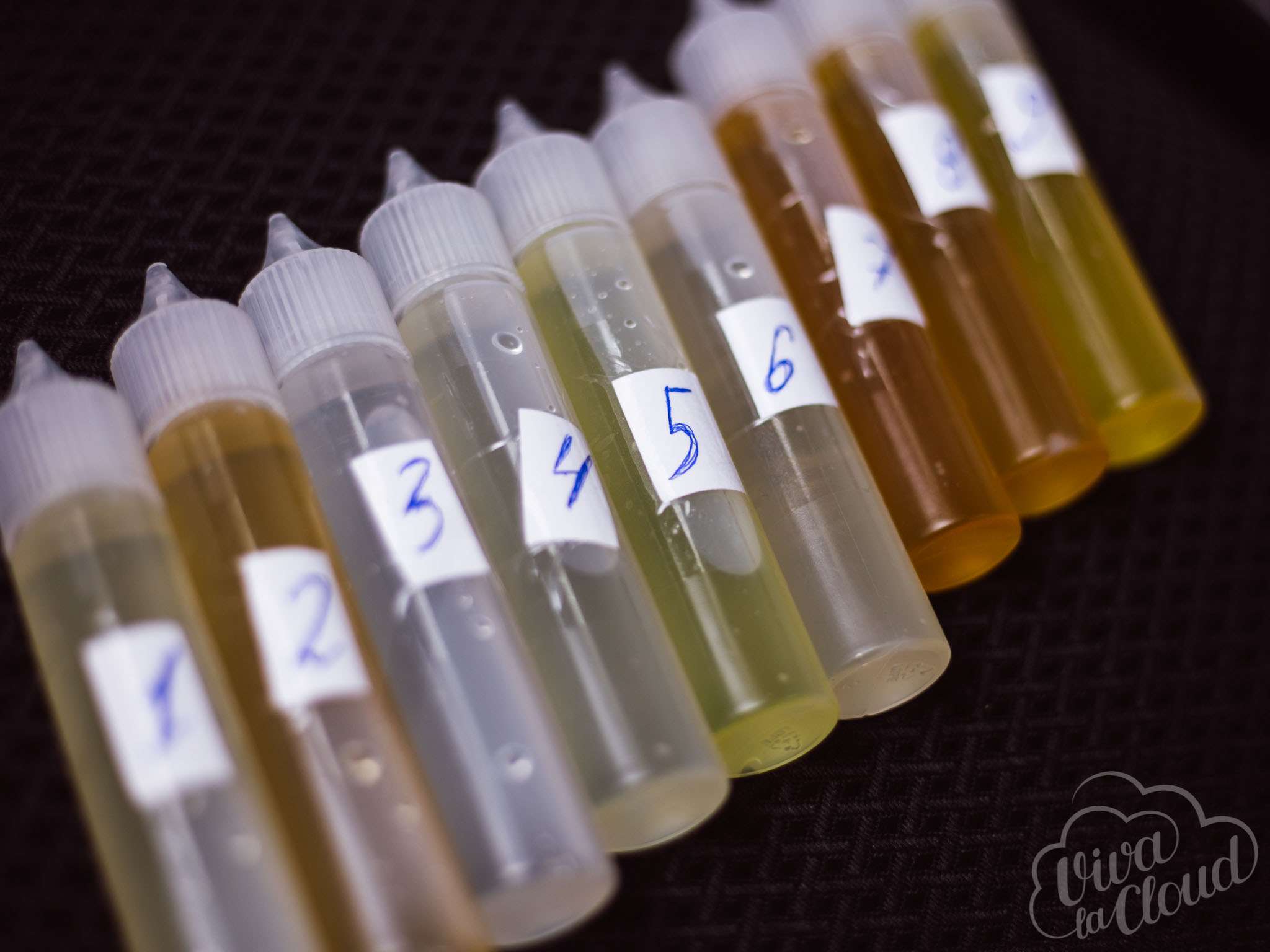 Для сравнения были взяты девять жидкостей от различных производителей. Тест проводился тремя сотрудниками ViVA la Cloud. Жидкости перелили в пронумерованные прозрачные флаконы. Сотрудники попробовали все миксы, выставив им оценки от 1 до 10.