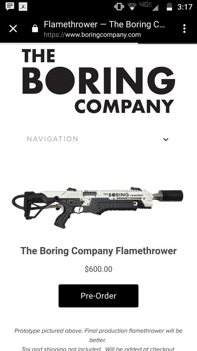 The Boring Company Илона Маска может начать продажи огнемета. Такой вывод сделали в интернете, покопавшись на сайте компании. Если звезды сойдутся, огнемет будет стоить 600 долларов и появится в продаже в апреле 2018-го.