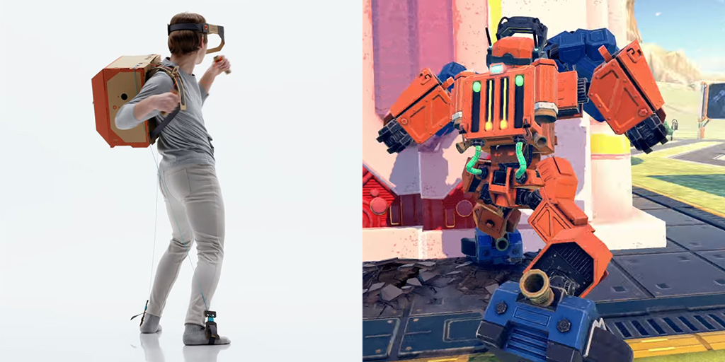 Второй набор — Nintendo Labo Robot Kit — VR-робот-рюкзак. Эта игра состоит, грубо говоря, из 4 частей. Рюкзак с установленным джойстиком вешается на спину, из него исходят специальные веревочки. Части для ног крепятся на ступнях и «общаются» с рюкзаком посредством веревочек. Части для рук тоже соединены с рюкзаком веревочками. Наконец, на лоб вешается эдакий VR-шлем с джойстиком (судя по всему, следит за положением головы), в который установлена Switch с игрой — в видео это что-то с «Трансформерами».