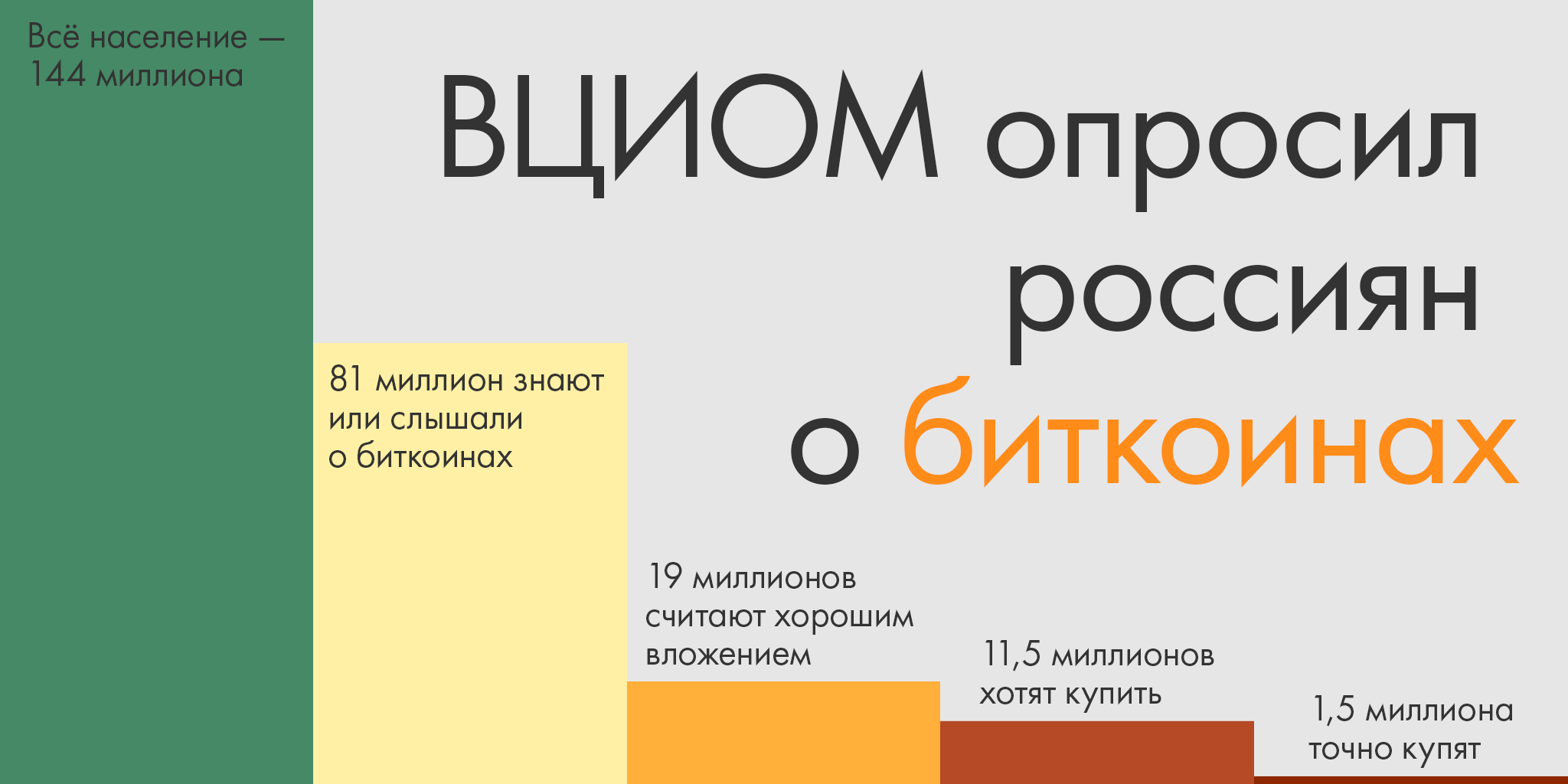 Из опроса стало известно, что о биткоинах слышали больше половины россиян — почти 81 миллион человек при переводе в абсолютные числа. «Хорошо» разбираются в предмете почти 19 миллионов человек, а свыше 43 миллионов (главным образом те, кто редко или совсем не пользуются интернетом) сообщили, что впервые услышали такое слово от работников ВЦИОМа.
