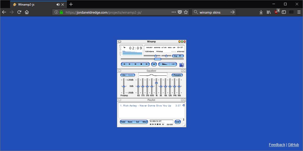Winamp сделали браузерным приложением. Интернет-версия плеера позволяет слушать музыку со своего компьютера в браузере, пользоваться скинами, создавать плейлисты и управлять эквалайзером. Завершив работу с плеером, его можно закрыть. В таком случае, окно браузера станет пустым.