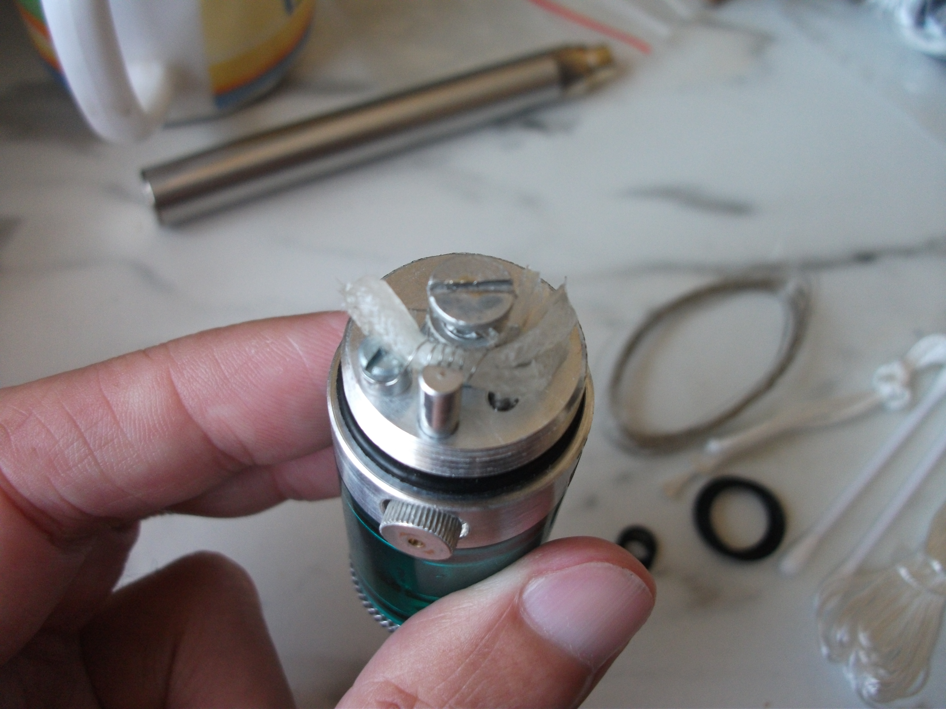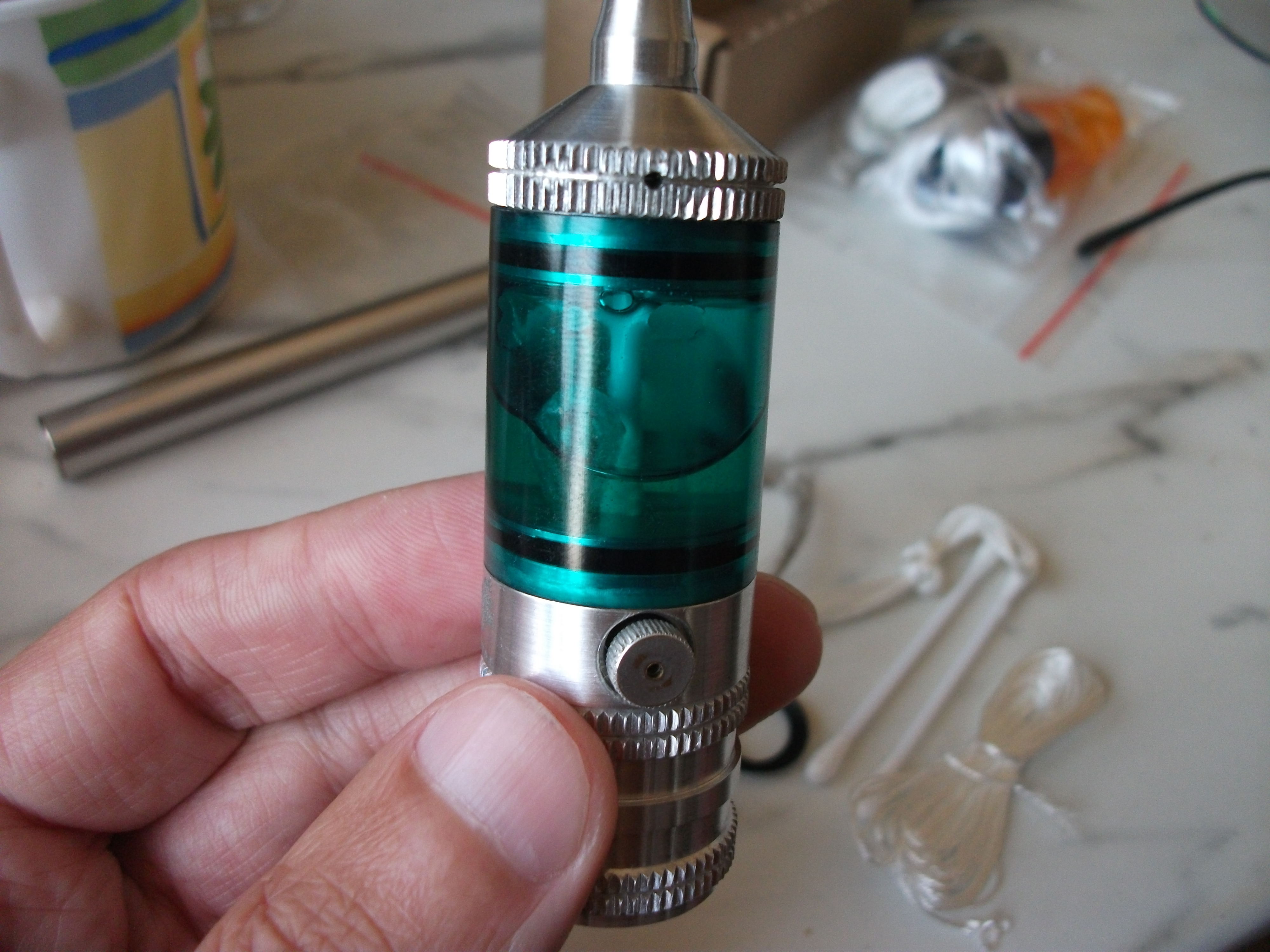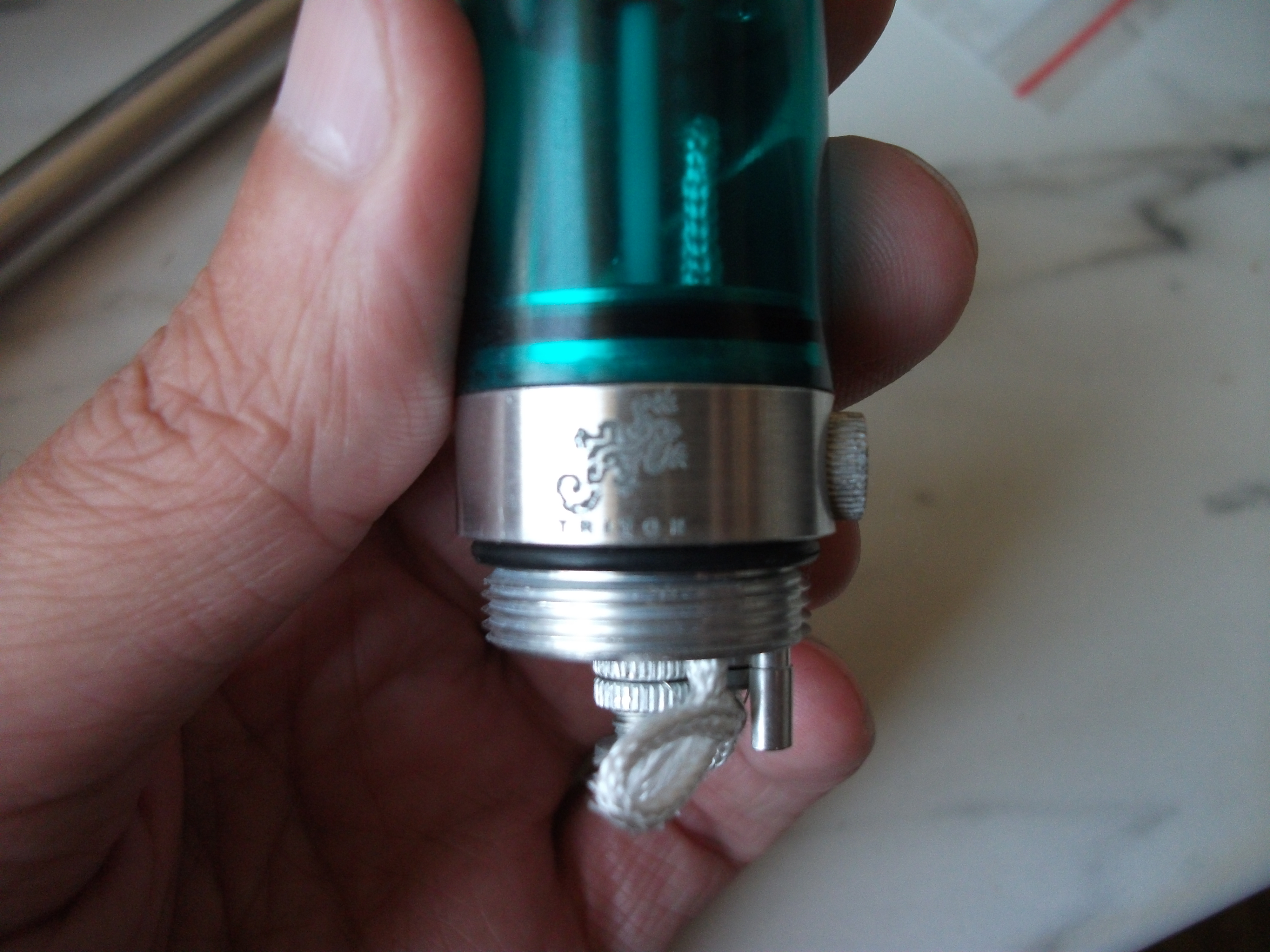 Бак был не менее изощренным. Воздух забирался сбоку, а сила обдува регулировалась поворотом специального кольца. Бак находился сверху от базы, в качестве шахты использовалась ушная палочка. Всё вечно текло независимо от правильности укладки кремнеземного фитиля. Но это было не особенно страшно: под основным баком был дополнительный — “сливной”.