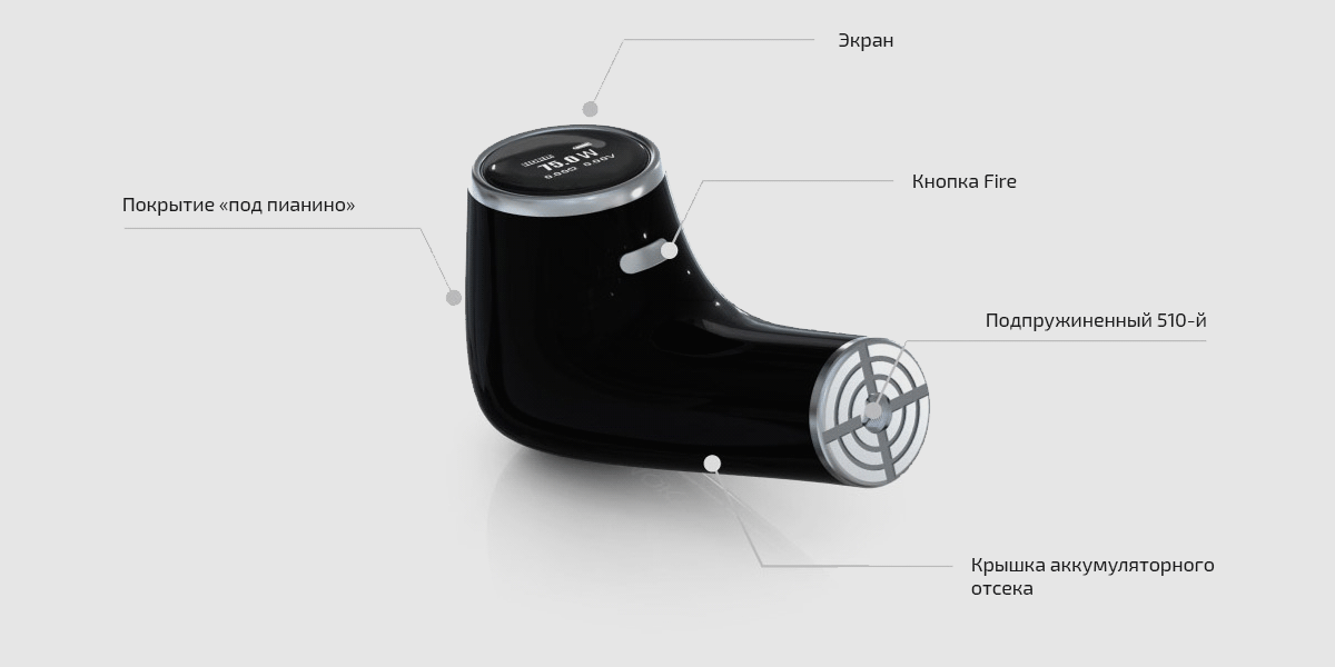 Joyetech Elitar исполнен в форм-факторе обычной курительной трубки. Там, где надо вдыхать, есть 510-й для бака. Дальше, как бы на изгибе, есть кнопка Fire. Затем — экран и регулировочные кнопки на нем. Сзади — магнитная крышка для 18650-го аккумулятора.