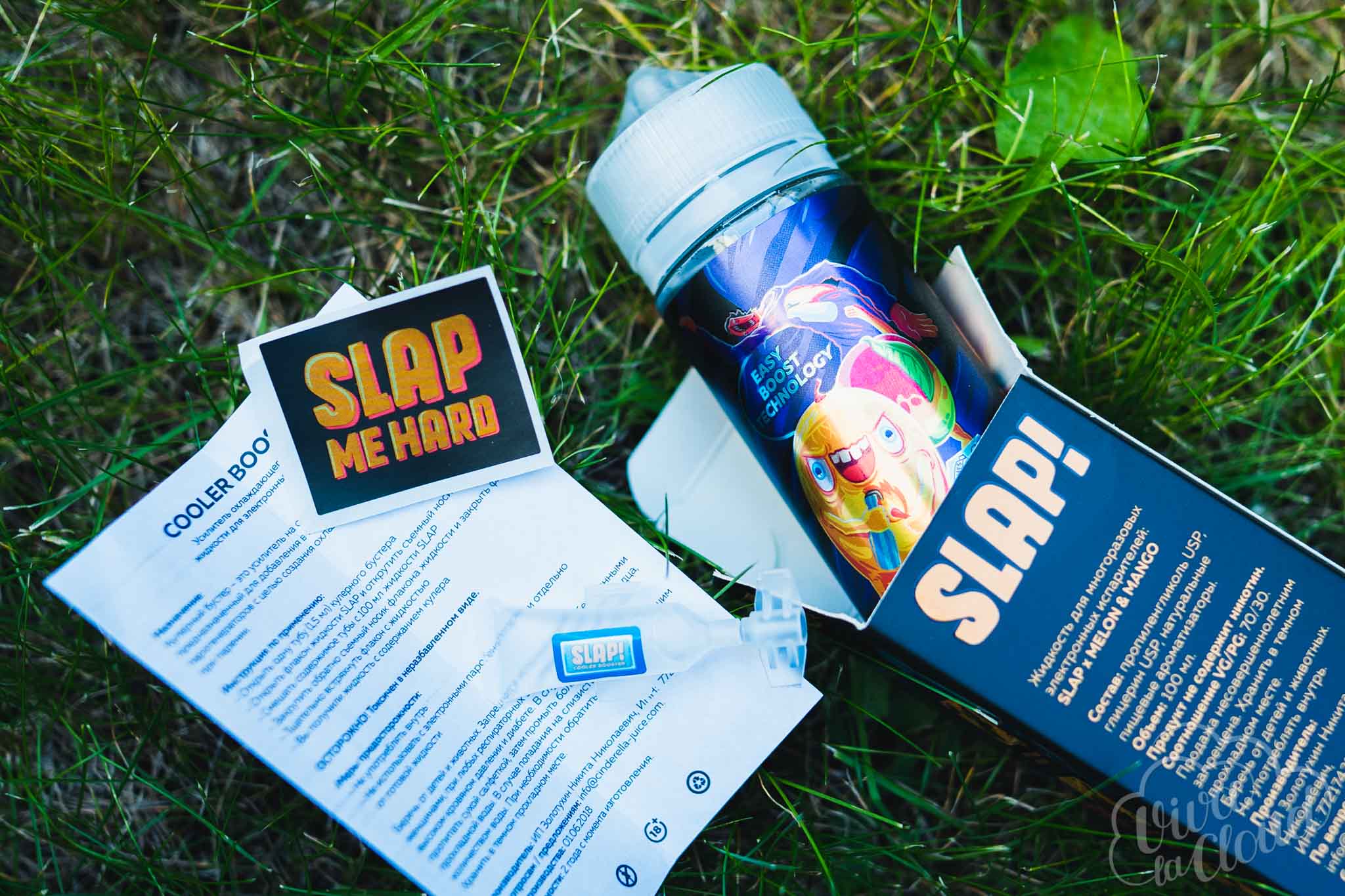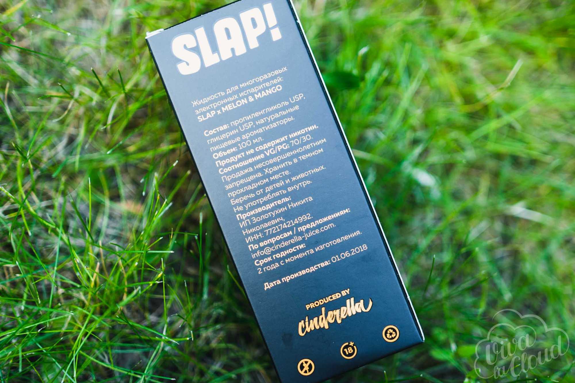 Поставляется Slap! в ярких картонных коробках. Декоративные элементы выделяются глянцевым покрытием. На лицевой стороне изображены агрессивно настроенные фрукты, обвешанные различным вооружением. Это — указатели на направленность вкуса. Рядом с ожившими персиками — пометка, сообщающая о лежащем внутри кулер-бустере. Неподалеку от кровожадных плодов есть названия линейки и микса, а также указания на объем с балансом. На одной из боковых граней — инструкция по добавлению бустеров во флакон. На противоположной — QR-код, ведущий на сайт производителя. На обратной стороне можно найти состав, предупреждения, срок годности с датой розлива и юридические данные. Там же — маркировки. На дне — штрихкод.