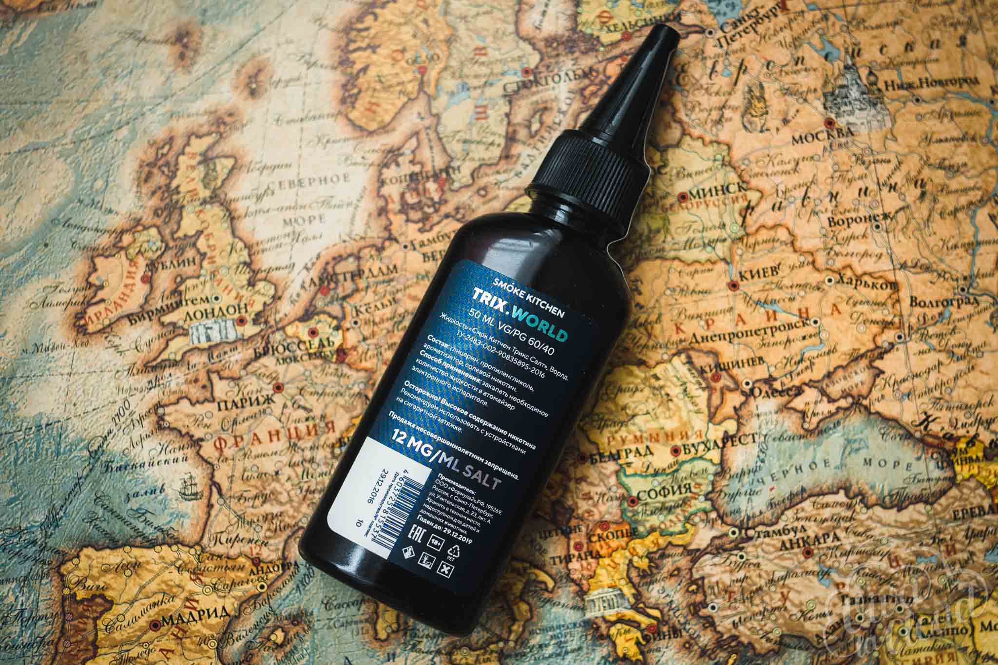 Солевая вариация Trix поставляется в привычных для Smoke Kitchen флаконах из темного пластика. Они стали, лишь немного уже и ниже. Объем — 50 мл. Носик-дозатор защищен откручивающейся крышкой, на которую наклеен контроль первого вскрытия с логотипом Smoke Kitchen. Защита от детей отсутствует. На флакон с обоих сторон наклеены этикетки из фольгированной пленки. Спереди написаны название линейки и вкус, сзади — объем, соотношение VG/PG, состав, способ применения, предупреждение о высокой концентрации никотина, крепость, вся юридическая информация, штрихкод, дата производства, срок годности и предупреждения.