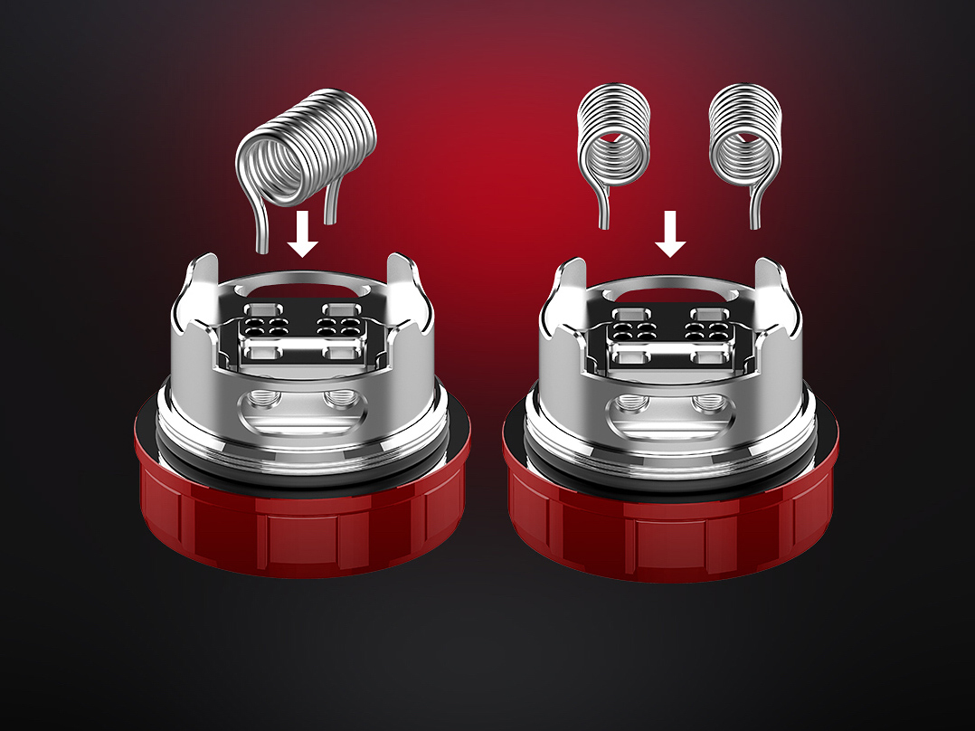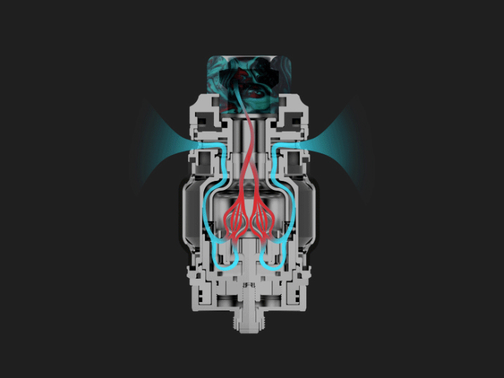 Внутри внешнего купола находится ещё один, обеспечивающий при повороте регулировку подачи жидкости в испарительную камеру. На деке располагаются четыре слота для фиксации одной либо двух спиралей, восемь отверстий нижнего обдува и два отдельных резервуара для укладки ваты. Ножки намотки устанавливаются сверху и прижимаются винтами в стенках базы. Помимо решётки нижнего обдува, воздушный поток поступает на спирали из под купола. Стандартный объём в 2 мл можно увеличить до 5 мл.