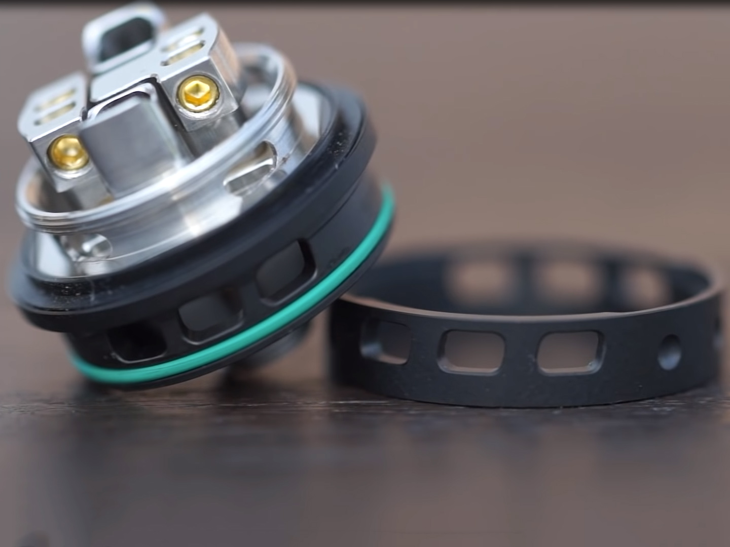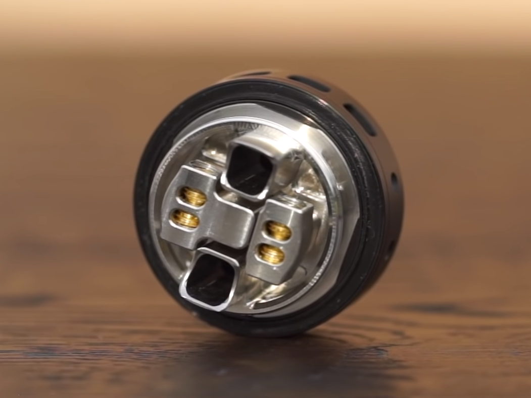 Внутри находится пара приземистых стоек и две угловатые трубы нижнего обдува, образующие для намотки своеобразное ложе. Ножки двух спиралей устанавливаются вертикально и фиксируются с боков позолоченными винтами под шестигранный ключ. На периферии располагаются ёмкие резервуары, Alex from VapersMD отмечает, что уложить вату в них можно даже ногой. Кроме того, разработчик обещает отсутствие протечек и не советует устанавливать массивные спирали. Объём бака составляет 3,2 миллилитра.