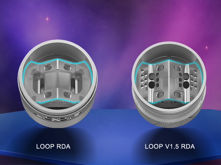 1 сентября компания Geekvape представила в инстаграме обновлённую дрипку — Loop V1.5 RDA. Стальной корпус выполнили в шести расцветках и дополнили гравированным узором, за исключением вращающегося кольца со знакомым логотипом. Оно, однако, без изменений не осталось. В новой версии отверстие обдува сделали в виде ромбовидной решётки. Слот под 810-е дриптипы расположили на невысокой площадке. В комплект включили два варианта из Ultem-пластика с профилями разной толщины.