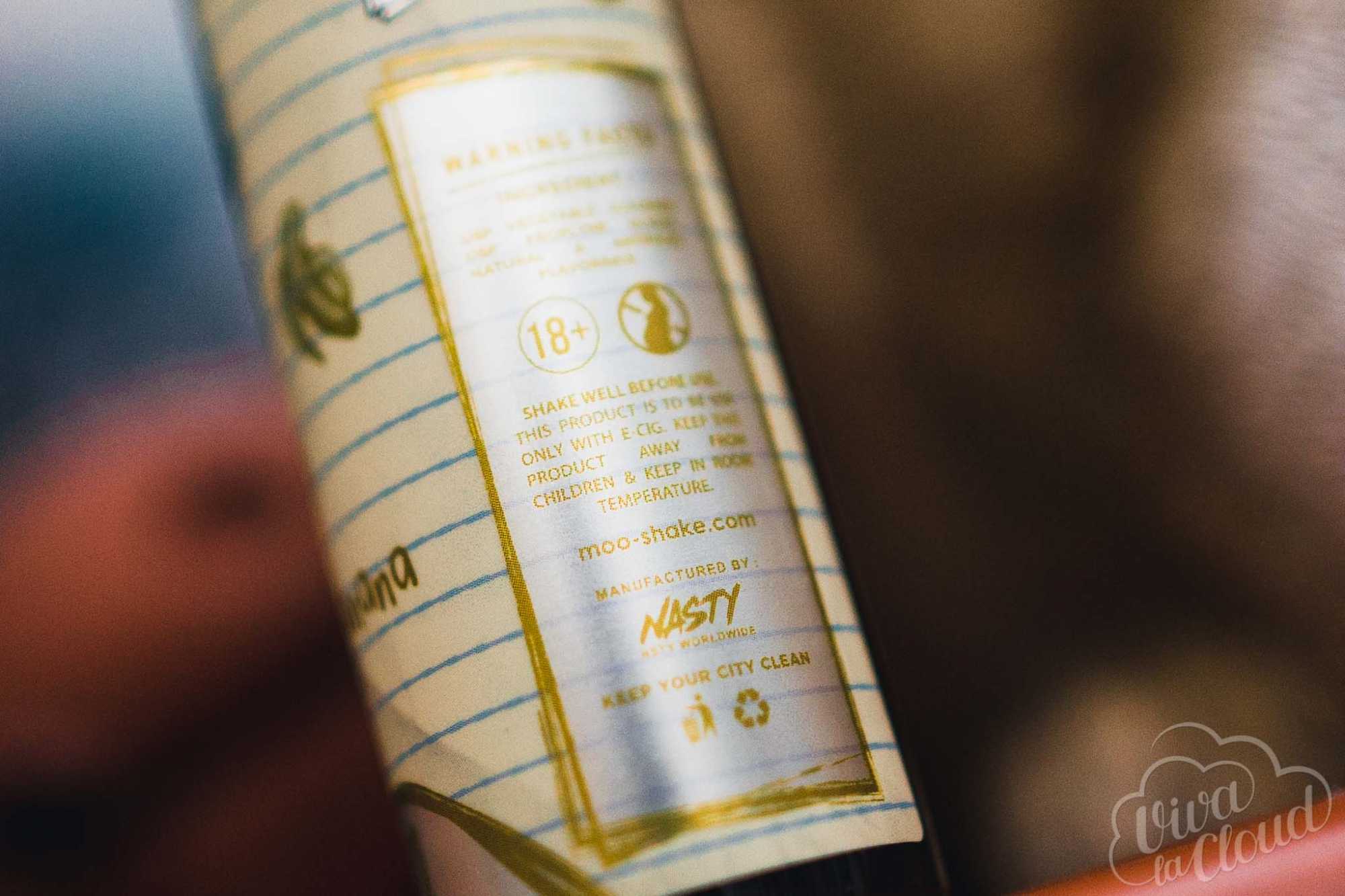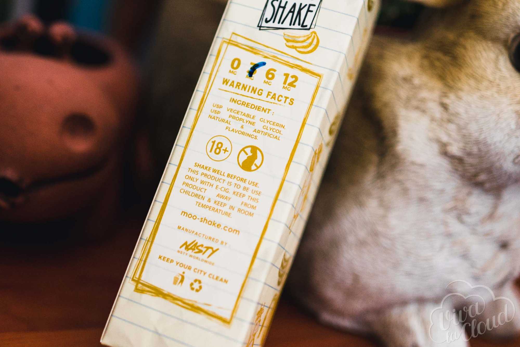 Нестандартность линейки видна сразу: если обычно жидкость от Nasty Juice приезжает в металлических кейсах, то Moo Shake поставляется в картонных коробках. Цвет оформления зависит от выбранного вкуса. Некоторые декоративные элементы выделяются глянцем. Фон упаковки стилизован под тетрадь. На лицевой стороне — «рисованная» корова, держащая в руке ключевой ингредиент микса. Рядом — названия, указания на объем с балансом. Вся информация о жидкости находится на обратной стороне коробки. Там можно найти актуальную крепость никотина, предупреждения, ссылки на сайт, состав и логотип производителя. Над ней кейса — серийный номер и срок годности.