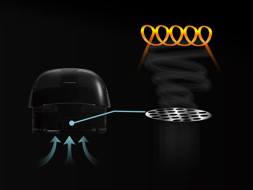 Плата позволяет установить напряжение на уровне 3,5 либо 4,2 вольт, зелёный и белый цвет соответственно. Переключение осуществляется тройным нажатием кнопки. Мощность варьируется от 7 до 13 ватт. Питание обеспечивает интегрированный аккумулятор ёмкостью 650 мАч. Сменный картридж укомплектован испарителем на 1,4 Ом и магнитным коннектором. Воздушный поток направляется по спиралевидному тоннелю, что по словам разработчиков должно положительно влиять на вкус. Объём бака составляет 2 мл.