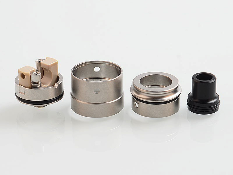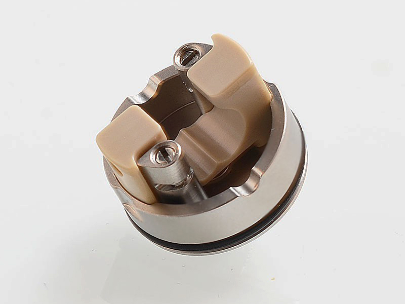 Внутри находятся две стойки для одной спирали и массивная вставка из термопластика, направляющая воздушный поток на намотку через два канала под небольшим углом. Ножки горизонтально фиксируются в соответствующих слотах и приживаются сверху винтами под прямую отвёртку. Стенки базы снабжены желобками для выравнивания намотки и неподвижной фиксации юбки. Обдув регулируется вращением топкепа, при желании одно из боковых отверстий можно полностью перекрыть. Имеется сквонк-пин.