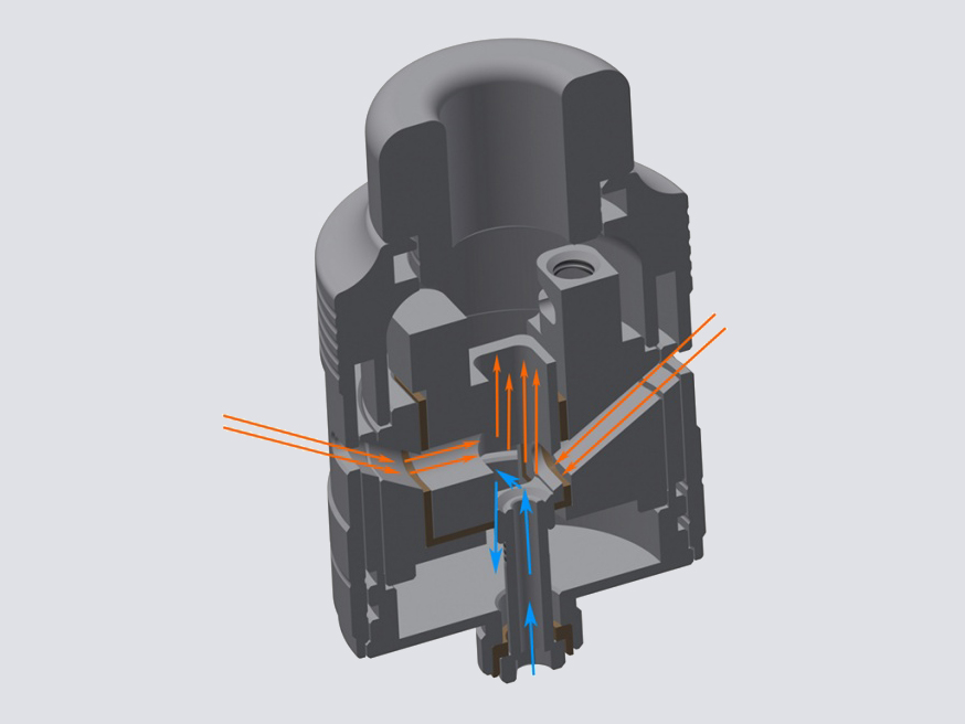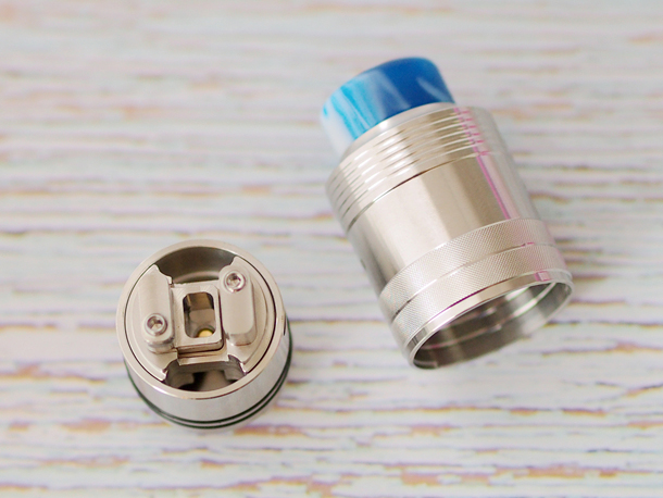 Внутри располагается пара стоек, обеспечивающая привычную горизонтальную установку одной спирали. Воздушный поток подаётся на намотку снизу, предварительно пройдя путь по наклонным боковым каналам, защищающим от протечек при заправке через дриптип. Площадь испарительной камеры сокращена за счёт внутреннего купола со сферической обработкой. Распластавшаяся под конструкцией ванночка, вкупе с высокими стенками базы образует вместительный резервуар объёмом 1,8 миллилитра. Присутствует BF-пин.