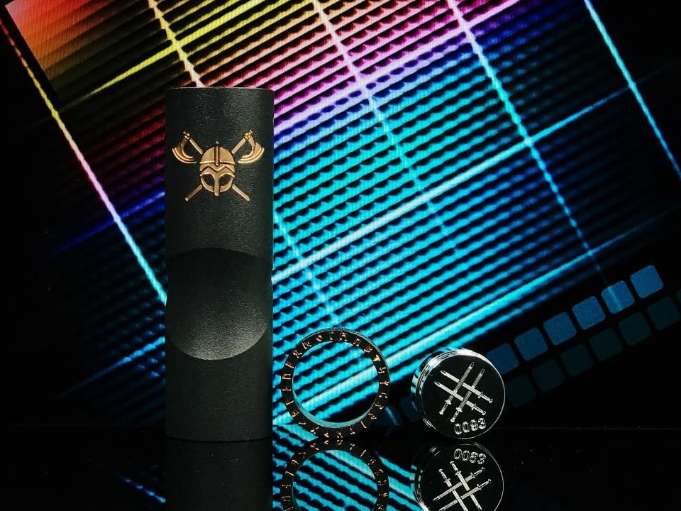 Подпружиненная кнопка обладает посеребрённой контактной группой и возможностью подстраиваться под коннекторы различной длины. Фиксируется на корпусе при помощи резьбового кольца с рельефным орнаментом и скандинавскими рунами. На нажимной поверхности кнопки выгравированы скрещённые пары мечей и индивидуальный номер. Внутренности мехмода — медные. Для питания нужен аккумулятор формата 18650.