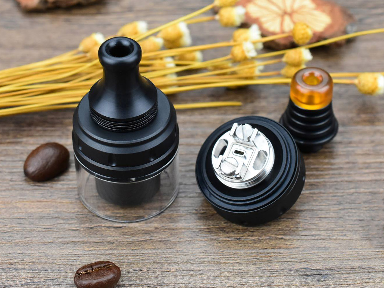 Под куполом со сферической обработкой скрыта двухстоечная дека с парой широких винтов для горизонтальной фиксации спирали и узким отверстием для её обдува. По бокам расположились два уменьшенных отверстия укладки ваты. Кольцо регулировки обдува стало съёмным. Обыкновенное стекло на 2 миллилитра можно заменить стальной колбой с фирменной гравировкой и увеличенным до 3 миллилитров объёмом.