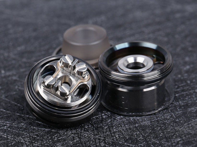 Внутри имеется пара стоек, на каждой предусмотрено по два винта для вариативной установки спирали. Ножки следует располагаются в горизонтальном положении между широкими шляпками с прорезями под прямую отвёртку. Под намоткой находится большое круглое отверстие, обеспечивающее нижний обдув. По бокам вырезаны сквозные резервуары для ваты. Стандартный объём в 2 мл можно увеличить до 3,5 мл.