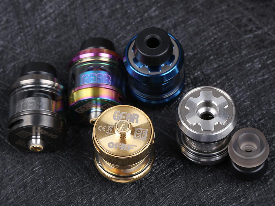 20 октября компания OFRF представила на странице в фейсбуке своё дебютное устройство — Gear RTA. В дизайн новоиспечённого обслуживаемого бака внесли несколько фирменных штрихов, выделяющих его из массы подобных девайсов. Профиль топкепа слегка скосили, а на его верхней площадке вырезали рельефную шестерёнку с отверстием под один из двух 510-х дриптипов. Оба получили оригинальный шестиугольный силуэт, однако, разный цвет и диаметр внутренних отверстий. На куполе выгравировали названия компании и модели. Снизу зафиксировали гладкое воздушное кольцо.