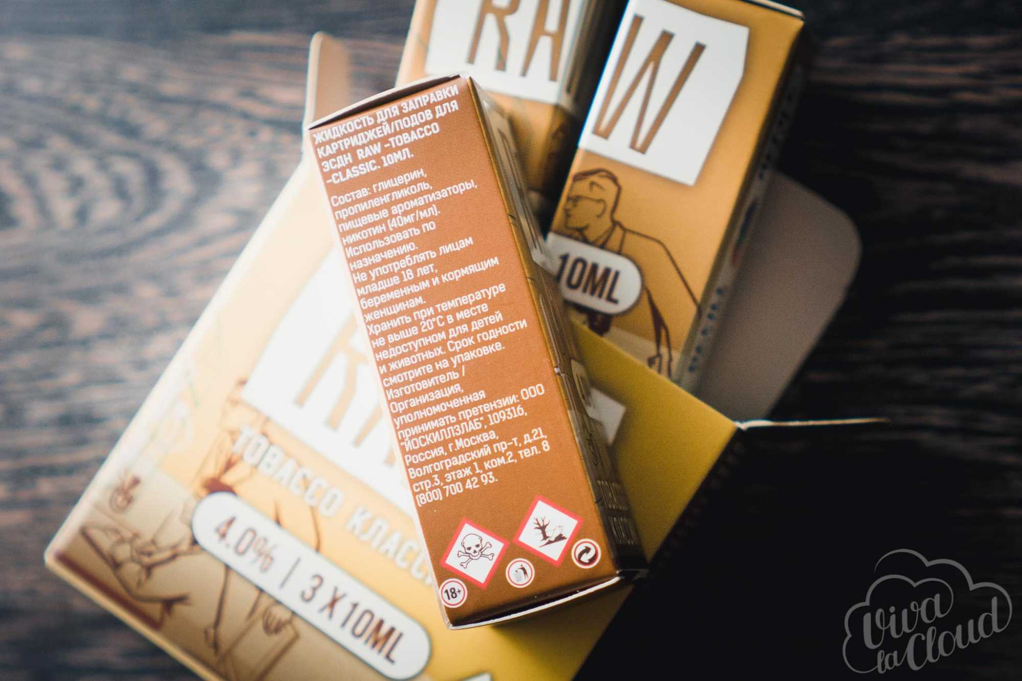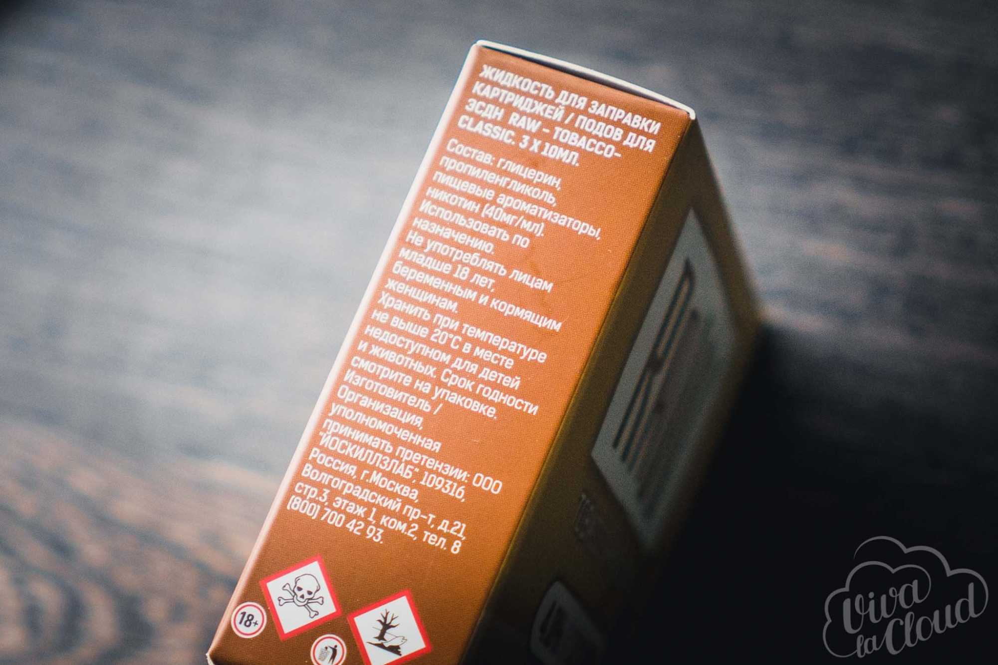 Набор из трех флаконов приезжает в картонной коробке. Стиль оформления зависит от выбранного микса. Некоторые элементы выделяются при помощи глянцевого покрытия. На «лицевых» гранях — названия и указания на крепость никотина с объемом. На одной из боковых сторон — русский информационный блок, включающий в себя состав, предупреждения и юридические данные. С противоположной стороны — все та же информация, но на английском языке.