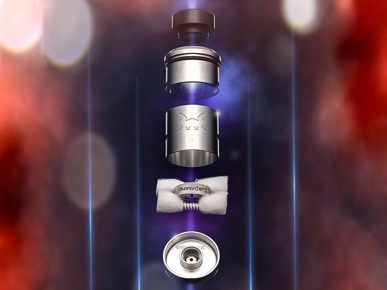 Внутри обработанного под конус купола скрывается база, рассчитанная на необслуживаемые модули с «намертво» зафиксированной намоткой. Пара горизонтальных спиралей, накрученных из «анархистов» доступна в двух вариациях — на 0,13 и 0,19 Ом. Воздушный поток подаётся сбоку и настраивается вращением крышки. Возможна установка сквонк-пина.