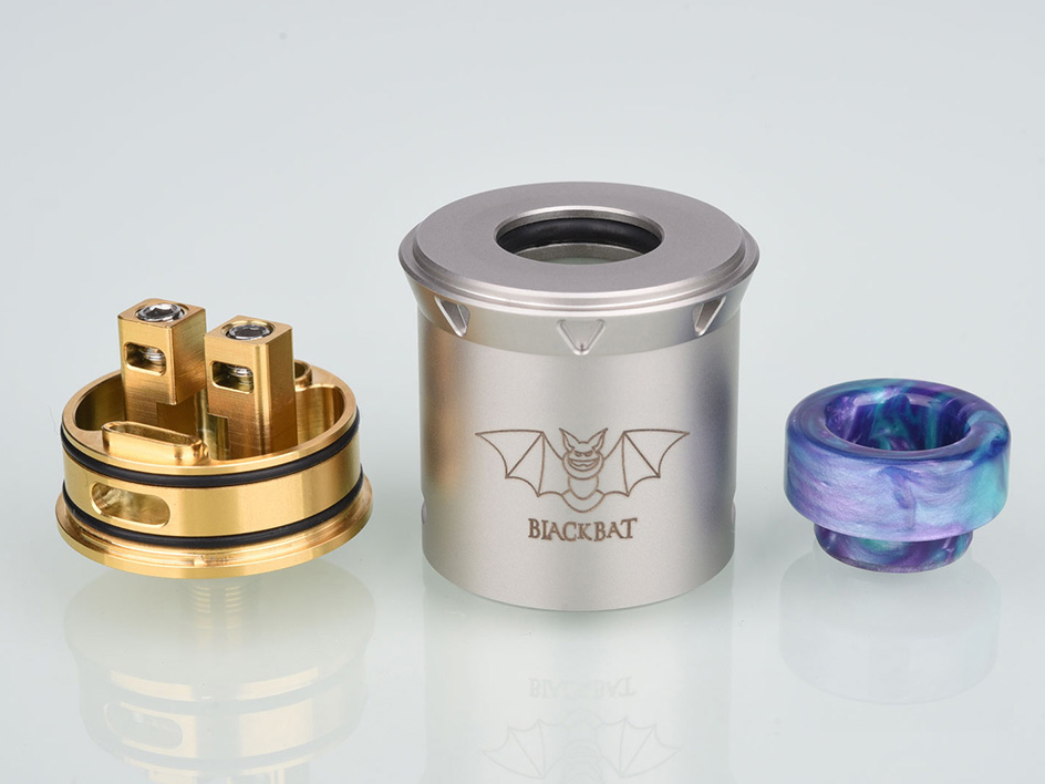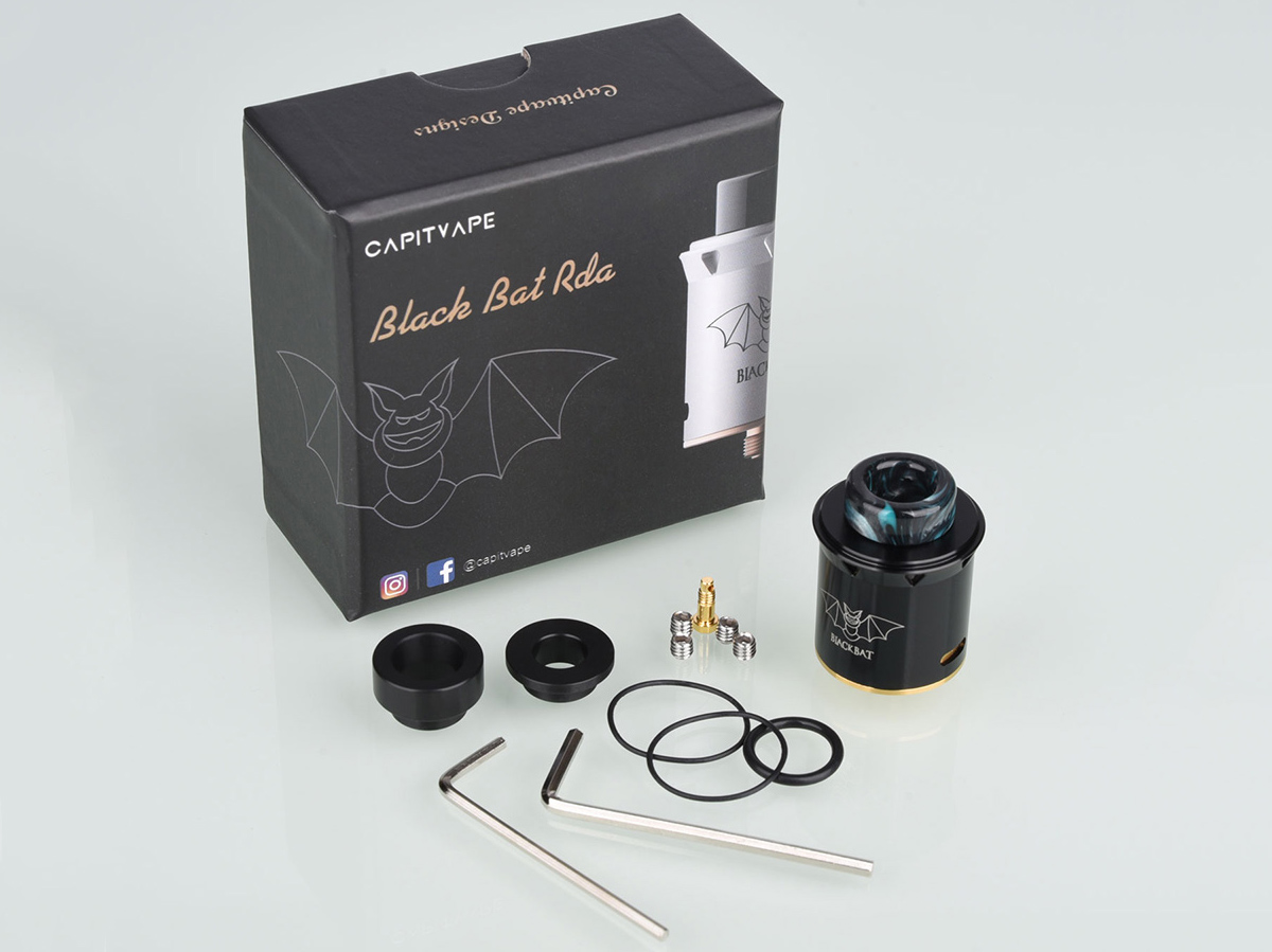 12 декабря новая китайская компания Capitvape анонсировала на странице в фейсбуке девайс Black Bat RDA. Монолитный купол реализовали из нержавеющей стали, в монохромной цветовой гамме. Вместо отдельного топкепа, на верхушке строгого цилиндра сделали расширение с треугольными вырезками. Верхнюю площадку перфорировали 810-м слотом. Помимо яркого дриптипа из эпоксидной смолы, набор разнообразили чёрным вариантом из обыкновенного термопластика. У основания юбки вырезали два горизонтально вытянутых отверстия, стенки украсили логотипом.