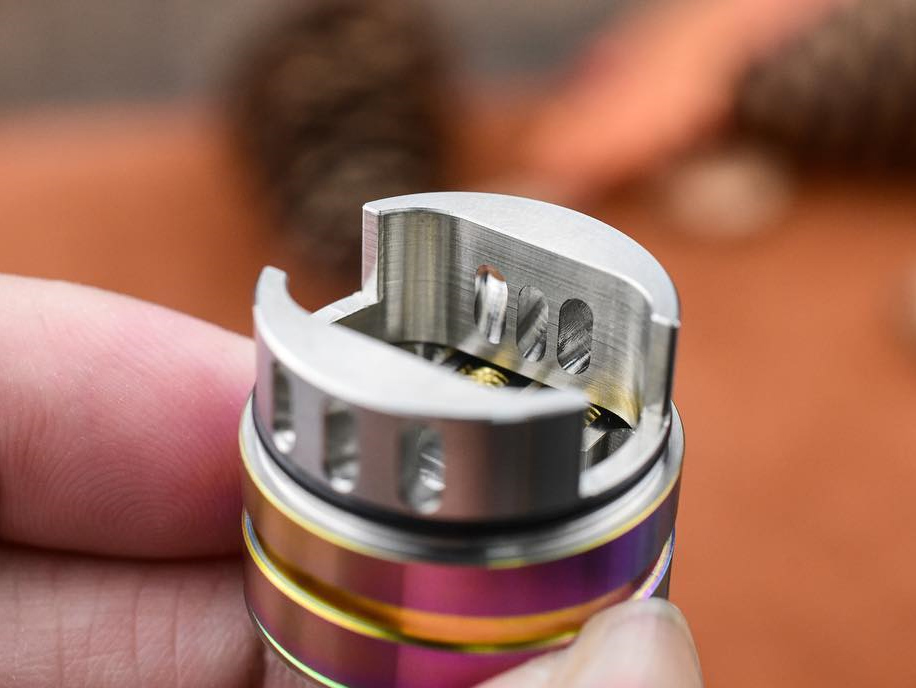 «Ступенчатая» дрипка от Augvape прекрасно подойдёт для ценителей лёгкой и вариативной установки спиралей. Прижимная Т-образная стойка позволяет фиксировать намотку как в горизонтальной, так и в вертикальной плоскостях. Стальную юбку и топкеп можно заменить монолитным куполом из матового термопластика.