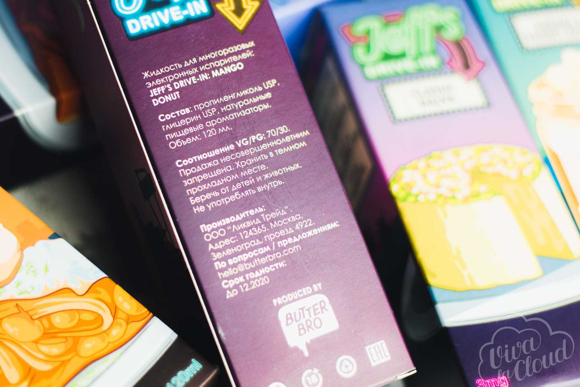 У Jeff’s Drive-In довольно оригинальные оформление и выбранная тематика. Жидкость моментально ассоциируется с небольшими заведениями, расположенными вдоль дорог. И флаконы, и коробки выглядят на твердую пятерку. На упаковке есть вся необходимая информация.