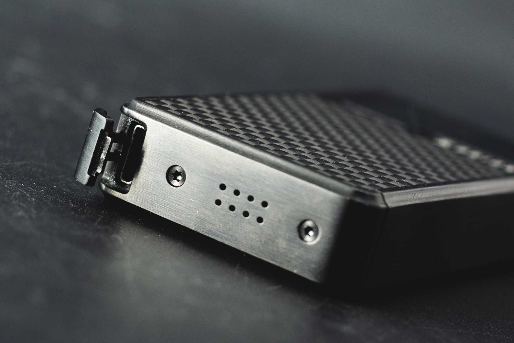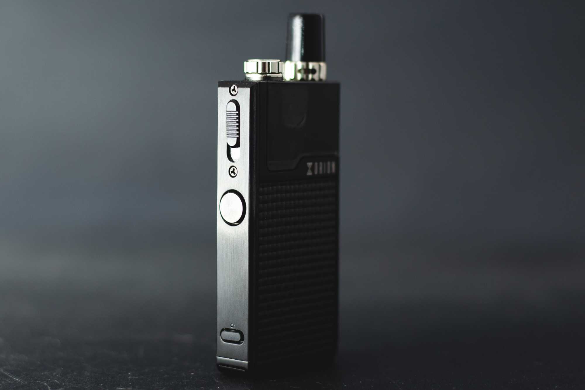 Сам девайс напоминает гибрид рации и древнего iCare, в который не завезли датчик затяжки (и хорошо). По бокам — «карбоновые» вставки. На дне — заглушка, закрывающая USB-порт для зарядки, а сбоку — индикатор актуального состояния, кнопки fire и select и «язычок», фиксирующий картридж. Сверху — дриптип с кольцом для регулировки затяжки и отверстие для заправки картриджа.